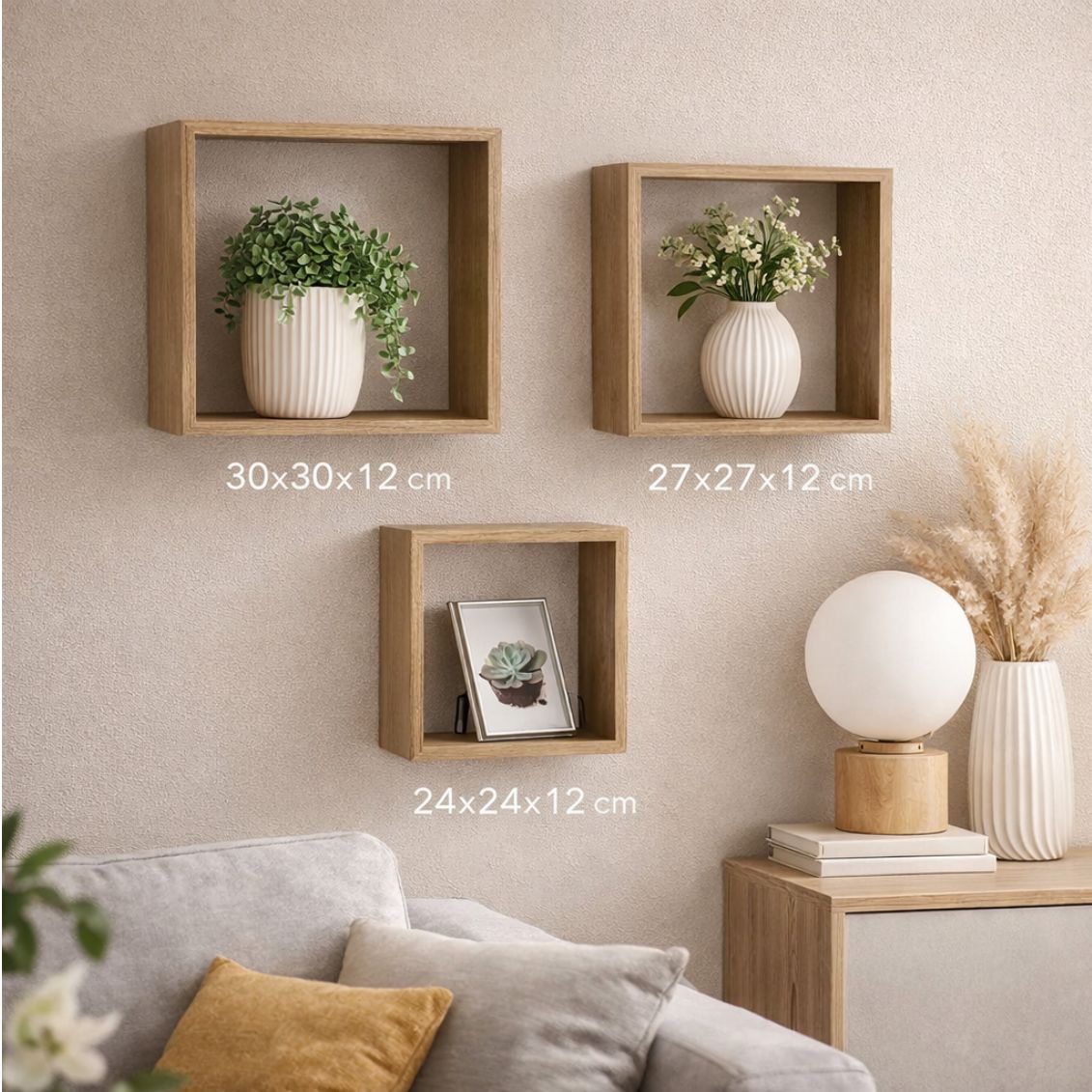 Il Set 3 Pensili Quadrati in Legno Rovere – Legno & Disegno by Gicos (art. A905-4-RB) è un kit di tre mensole cubo da parete in legno con finitura rovere naturale, in tre misure scalari: 30x30x12 cm, 27x27x12 cm e 24x24x12 cm. Installazione a parete libera, componibili in qualsiasi configurazione. Codice EAN: 8025569788727.