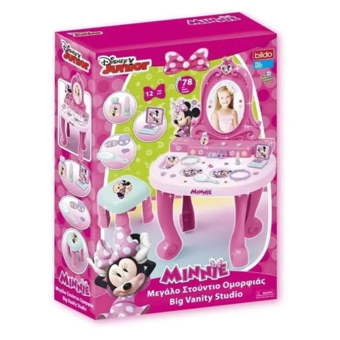 .La toeletta dei sogni per piccole fan di Minnie Mouse! Big Vanity Studio da 78cm di altezza con design esclusivo Disney Junior in rosa e fucsia. Include cassettiera giocattolo con aree speciali per accessori, specchio grande, specchio a mano, spazzola e sgabello coordinato. Un set completo per ore di divertimento nel mondo glamour di Minnie, sviluppando creatività, coordinazione e gioco di ruolo in totale sicurezza.