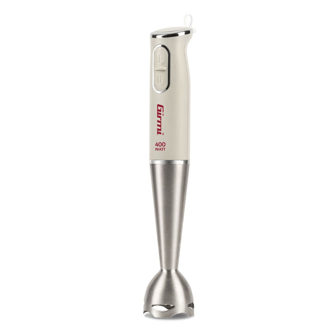 .Mixer ad immersione 400W con motore DC, 2 velocità selezionabili, fusto lungo acciaio inox 19 cm smontabile per lavaggio accurato, lame inox resistenti affilate, dotato di impugnatura ergonomica comoda antiscivolo, pulsante doppia velocità controllo precisione, design compatto leggero 530 grammi. Dimensioni ø 55 x 365 mm. Colore crema/argento. Alimentazione AC 230V 50-60Hz. Ideale frullare zuppe vellutate, preparare smoothie salse emulsioni, montare creme dolci.