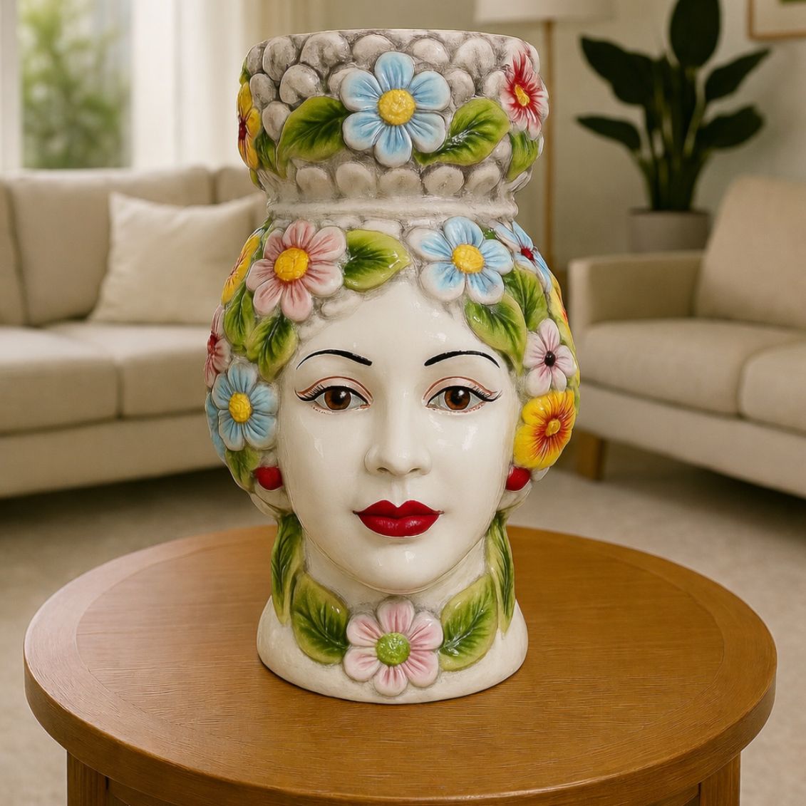 Rispetto alla versione maschile Art. 25001MUC — che presenta una decorazione floreale piu sobria con fiori gialli — il 25001MDC e il pezzo piu fiorito e cromaticamente ricco dell'intera linea Mori Siciliani Giardini di Marzo: fiori azzurri, rosa, gialli e rossi ricoprono capelli, fronte e collo, mentre la stessa ricchezza decorativa si ritrova sull'alzata a pigna grigia. Il risultato e un pezzo di grande impatto visivo che porta colore e vitalita in qualsiasi ambiente. Con 42 cm di altezza e la base 25,5x25,5 cm e il pezzo femminile piu importante della linea, ideale per chi desidera un elemento d'arredo di forte identita culturale e presenza scenica.