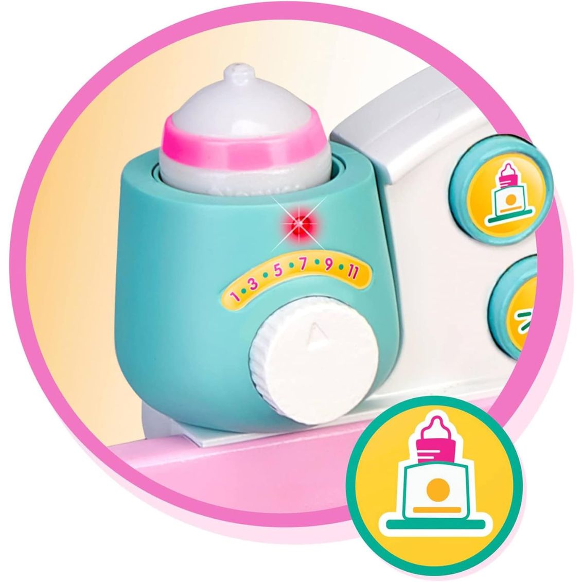 Adagia Nenuco nella culla: inizierà a piangere. Osserva i simboli sul pannellino e prova una funzione alla volta: avvia la ninna nanna, accendi la luce notturna, attiva il finto “riscaldamento” (linea LED blu/rossa), usa lo scaldabiberon con luce oppure proponi ciuccio e biberon. Quando indovini il bisogno, Nenuco si calma! Una routine di gioco imitativo che insegna cura ed empatia.