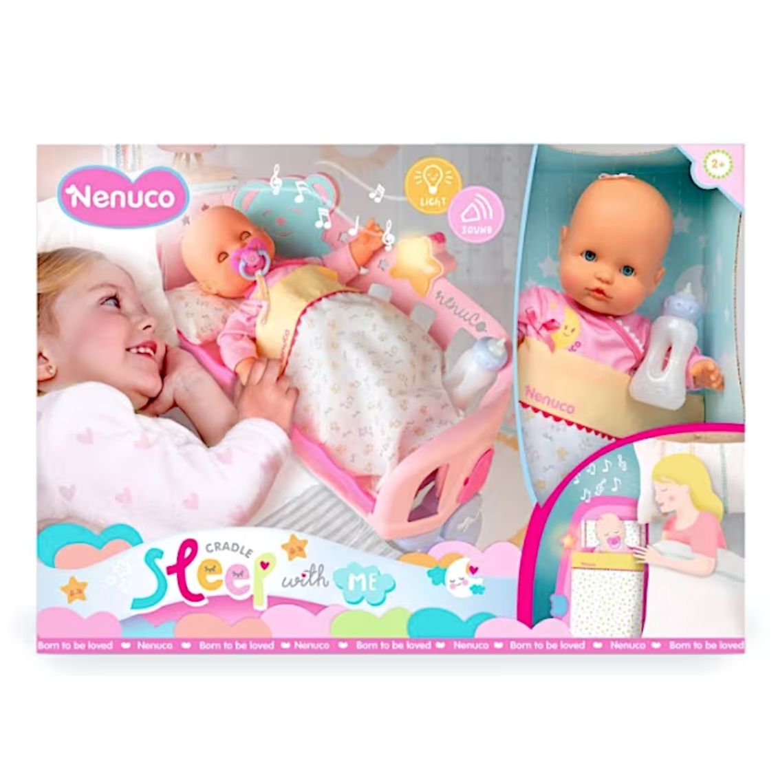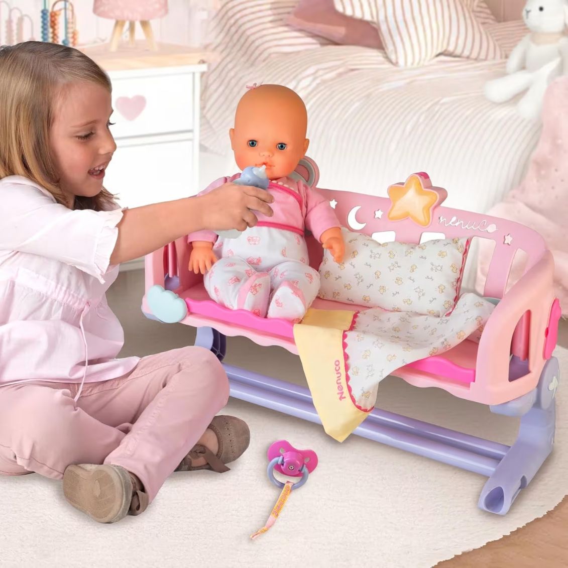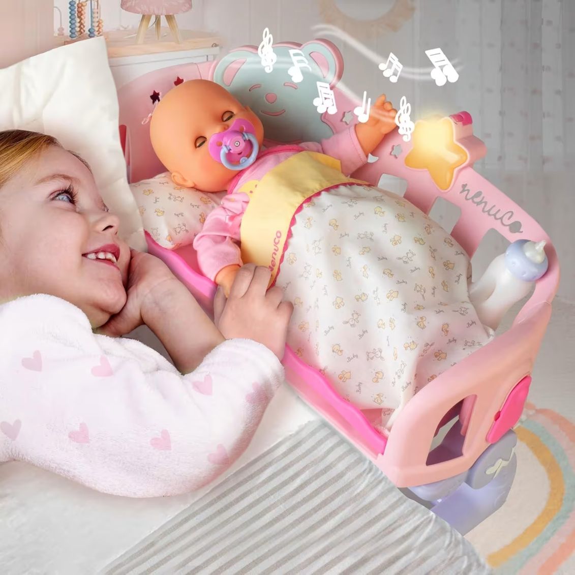 .Bambola Nenuco dal corpo morbido con lettino a sponda da affiancare al letto, luci e dolce ninna nanna. Include biberon, ciuccio e copertina per un gioco di cura realistico e coccoloso.