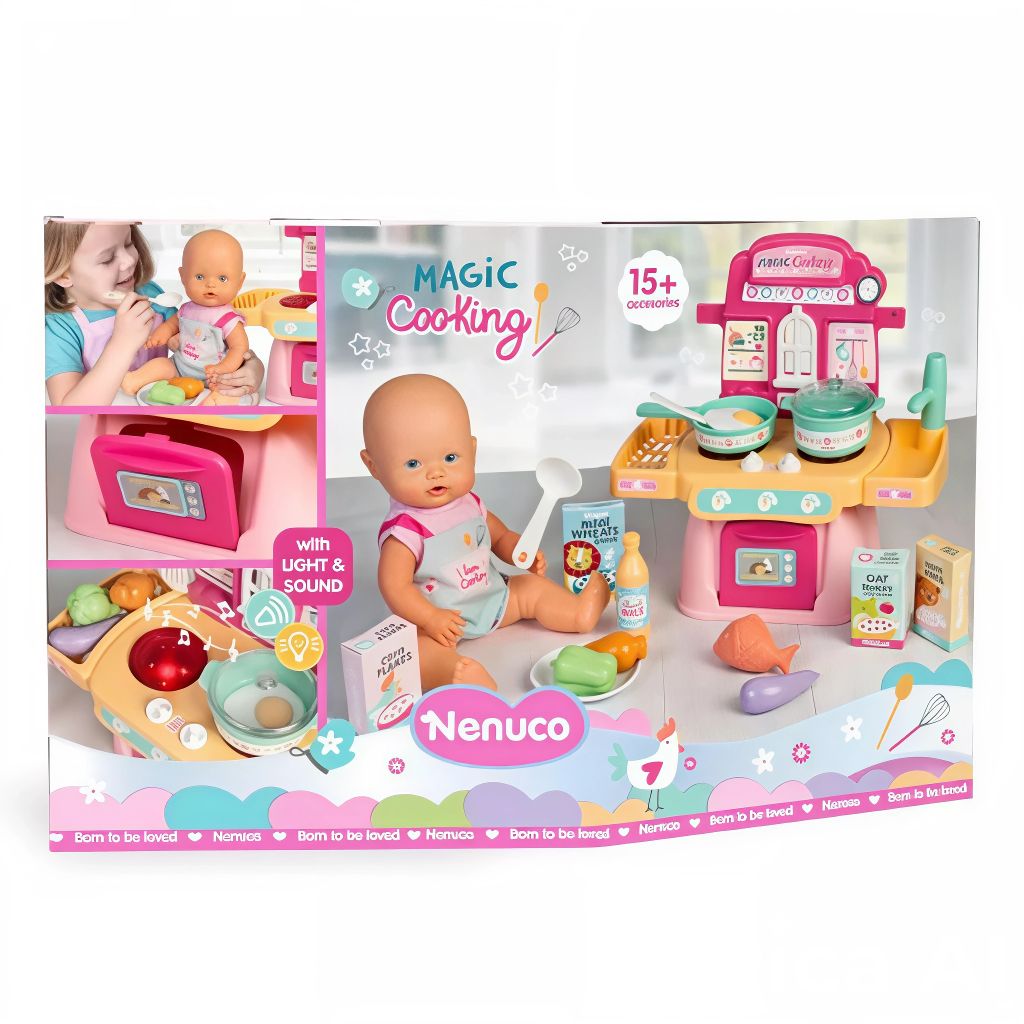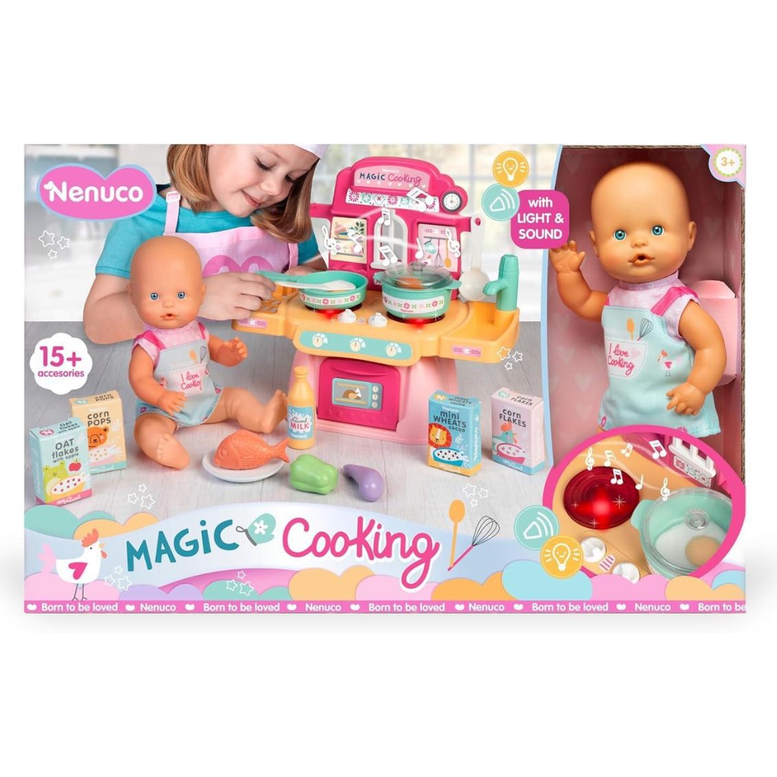 .Scopri il divertimento in cucina con Nenuco! Bambola 30cm con corpo rigido, vestitino rosa e grembiulino a tema. La cucina Magic Cooking riproduce suoni di bollitore e frittura, con 15+ accessori per preparare pappe e piatti creativi. Ideale per bambine dai 3 anni in su.