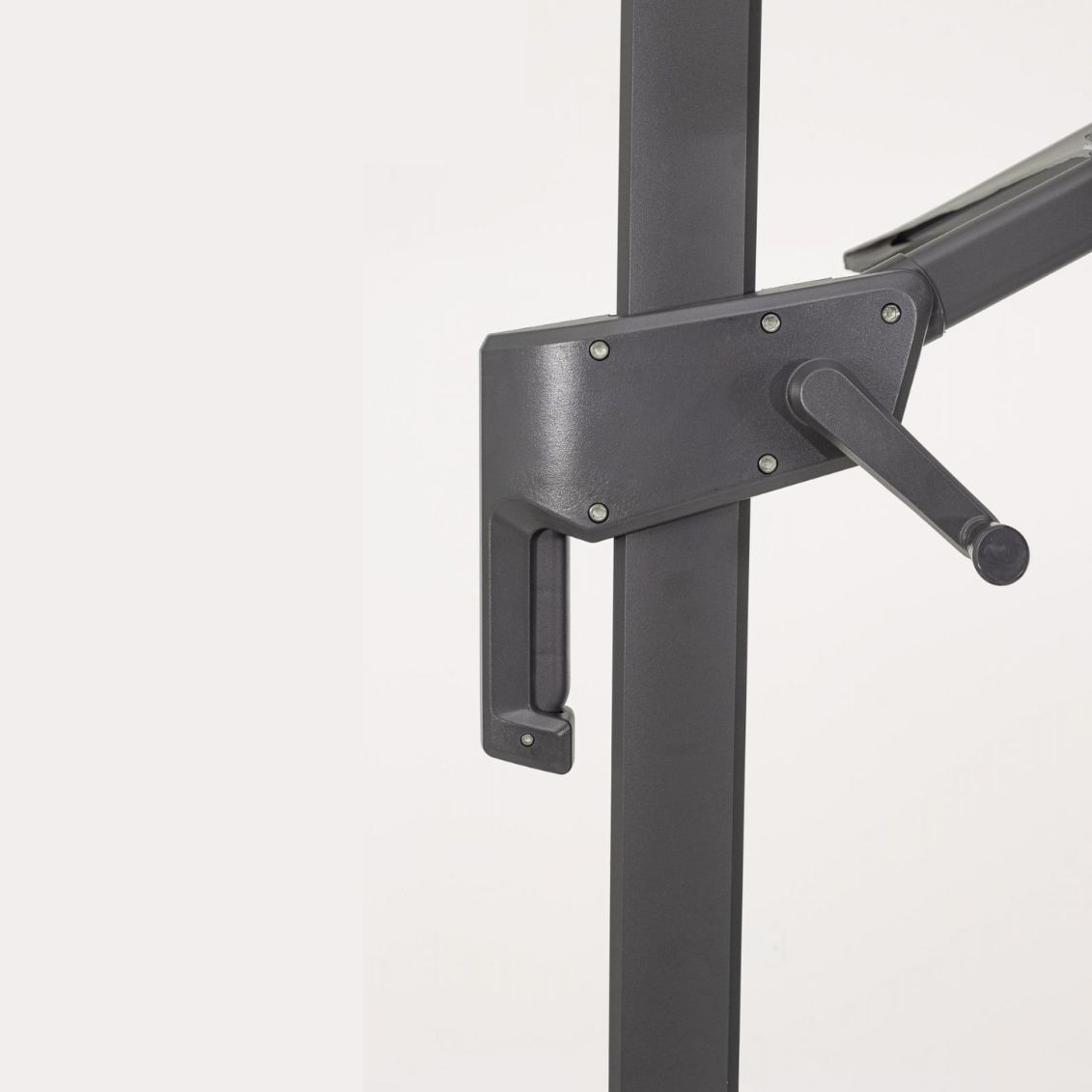 Posizionare la base a croce in acciaio su una superficie piana e stabile, quindi caricarla con piastrelle di cemento o zavorra (non incluse) per garantire la stabilità dell'ombrellone, specialmente in caso di vento. Montare il palo portante nella sede della base e collegare il braccio sospeso secondo le istruzioni incluse. Il palo è girevole a 360°: allentare il meccanismo di blocco, orientare nella direzione desiderata e ribloccarlo.