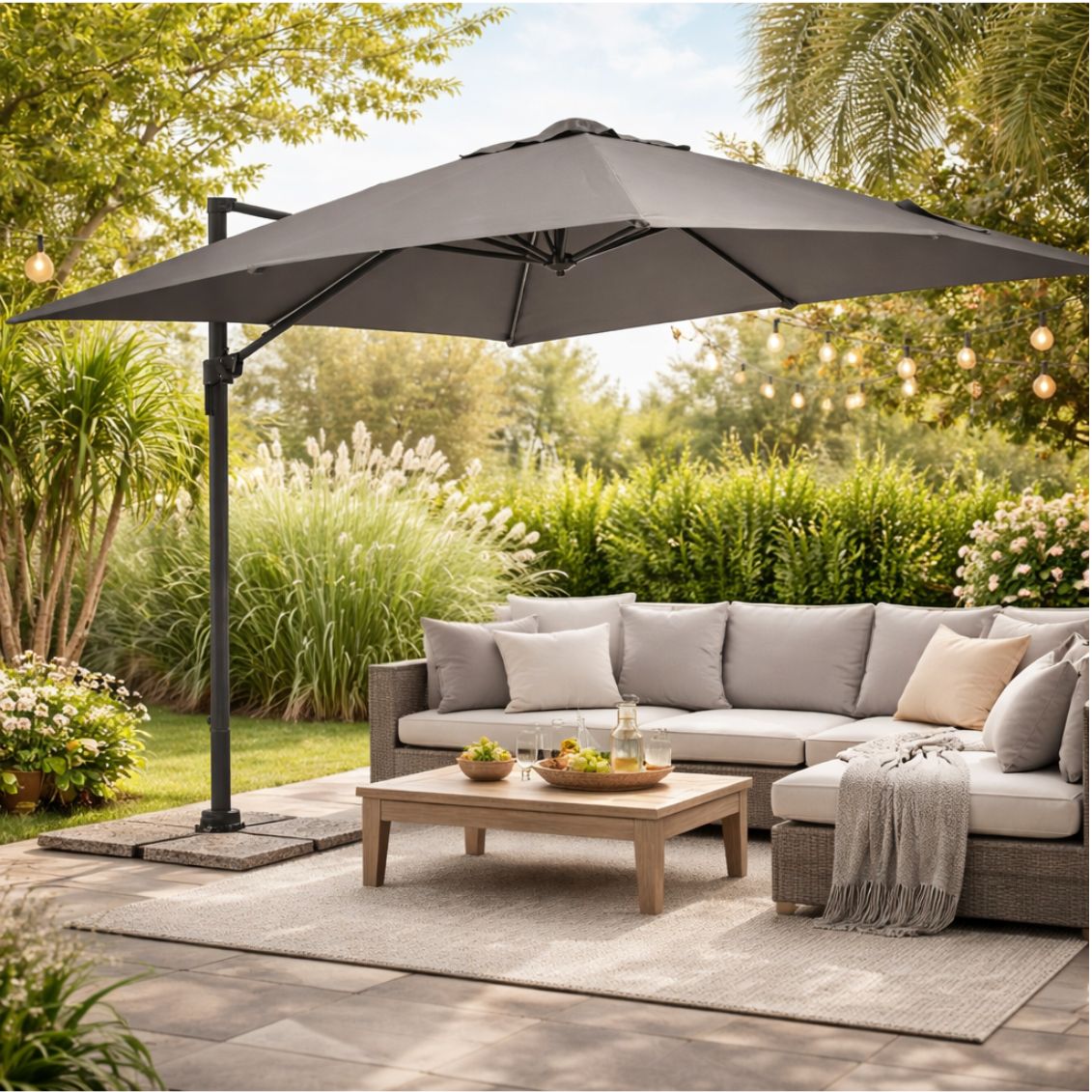 Il design a braccio laterale decentrato è il vantaggio principale di questo ombrellone: l'assenza del palo centrale libera completamente lo spazio sottostante, permettendo di posizionare tavoli, lettini e sedute senza ostacoli. La rotazione a 360° del palo consente di orientare l'ombra in qualsiasi direzione seguendo il sole nel corso della giornata. La struttura mista in alluminio e acciaio garantisce resistenza e durabilità, mentre il telo in poliestere da 200 gr/m² con camino antivento assicura protezione solare e stabilità anche in presenza di brezza. Una soluzione completa per giardini, terrazze e bordi piscina.