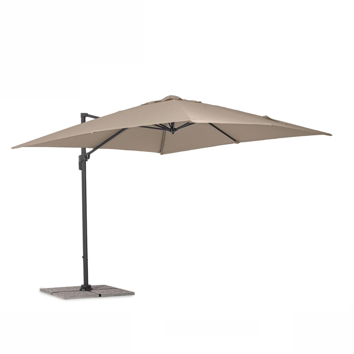 Bizzotto Siviglia è un ombrellone a braccio decentrato 3x3 m con struttura in alluminio antracite, telo in poliestere 200 gr/m² tortora con camino antivento, palo girevole a 360° e base a croce in acciaio inclusa. Codice EAN: 8051836791145.