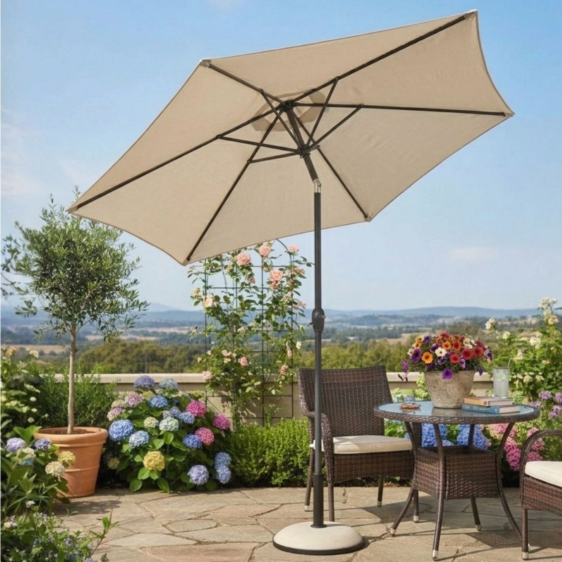 No, la base non è inclusa e va acquistata separatamente in base alle proprie esigenze di stabilità e al tipo di superficie su cui viene posizionato l’ombrellone.