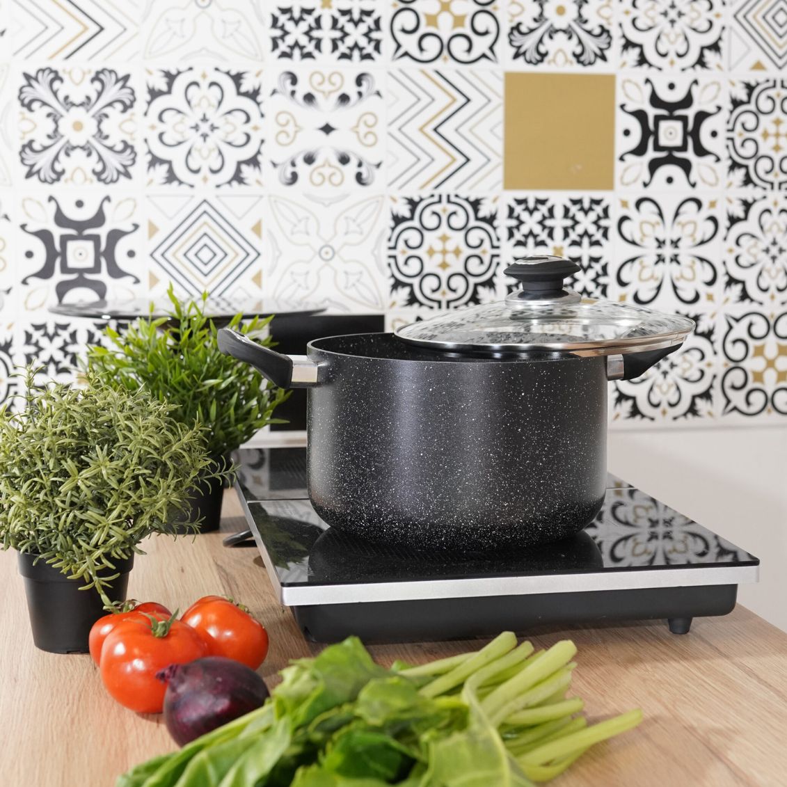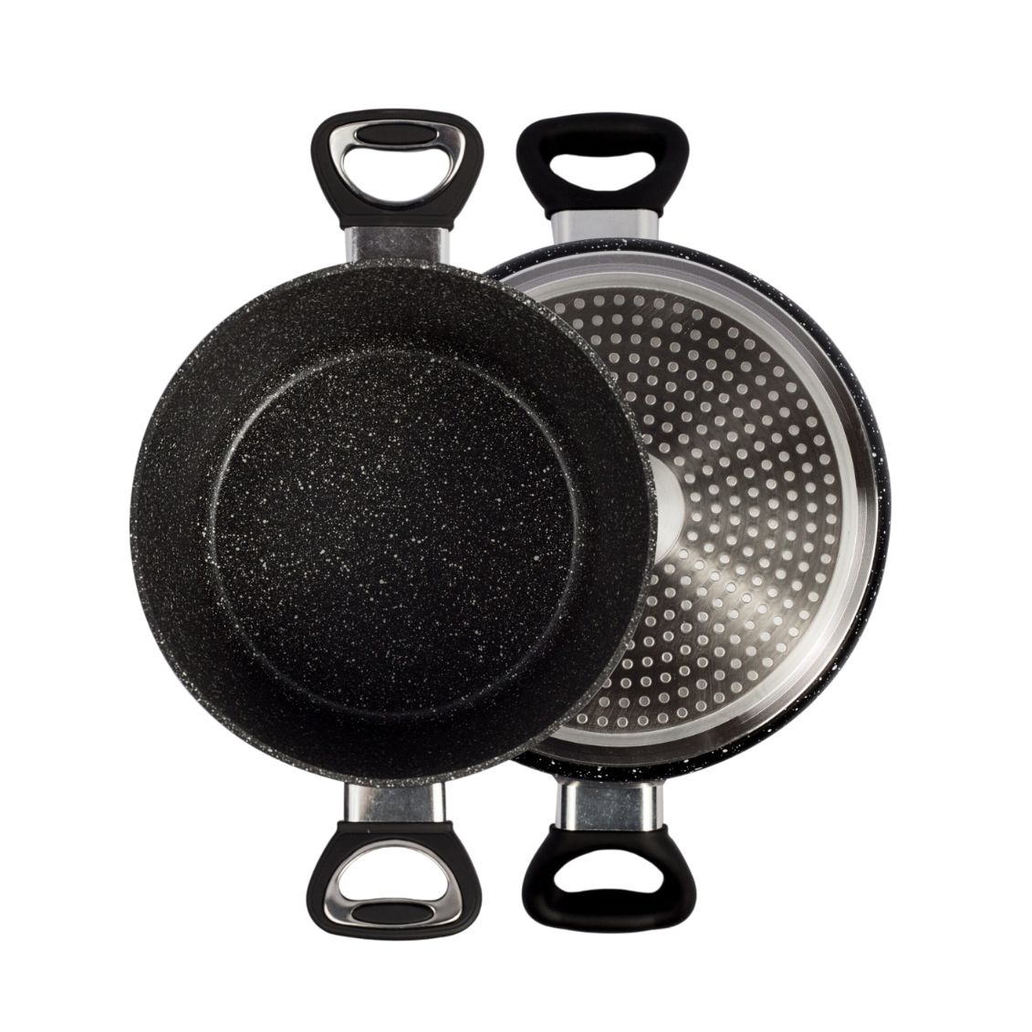 La sua forma alta e robusta la rende ideale per preparare zuppe, minestre, risotti e tutte quelle ricette che richiedono maggiore capienza e minor dispersione di liquidi. Il rivestimento antiaderente con finitura effetto pietra garantisce una cottura uniforme e senza attaccamento degli alimenti, facilitando incredibilmente la pulizia.