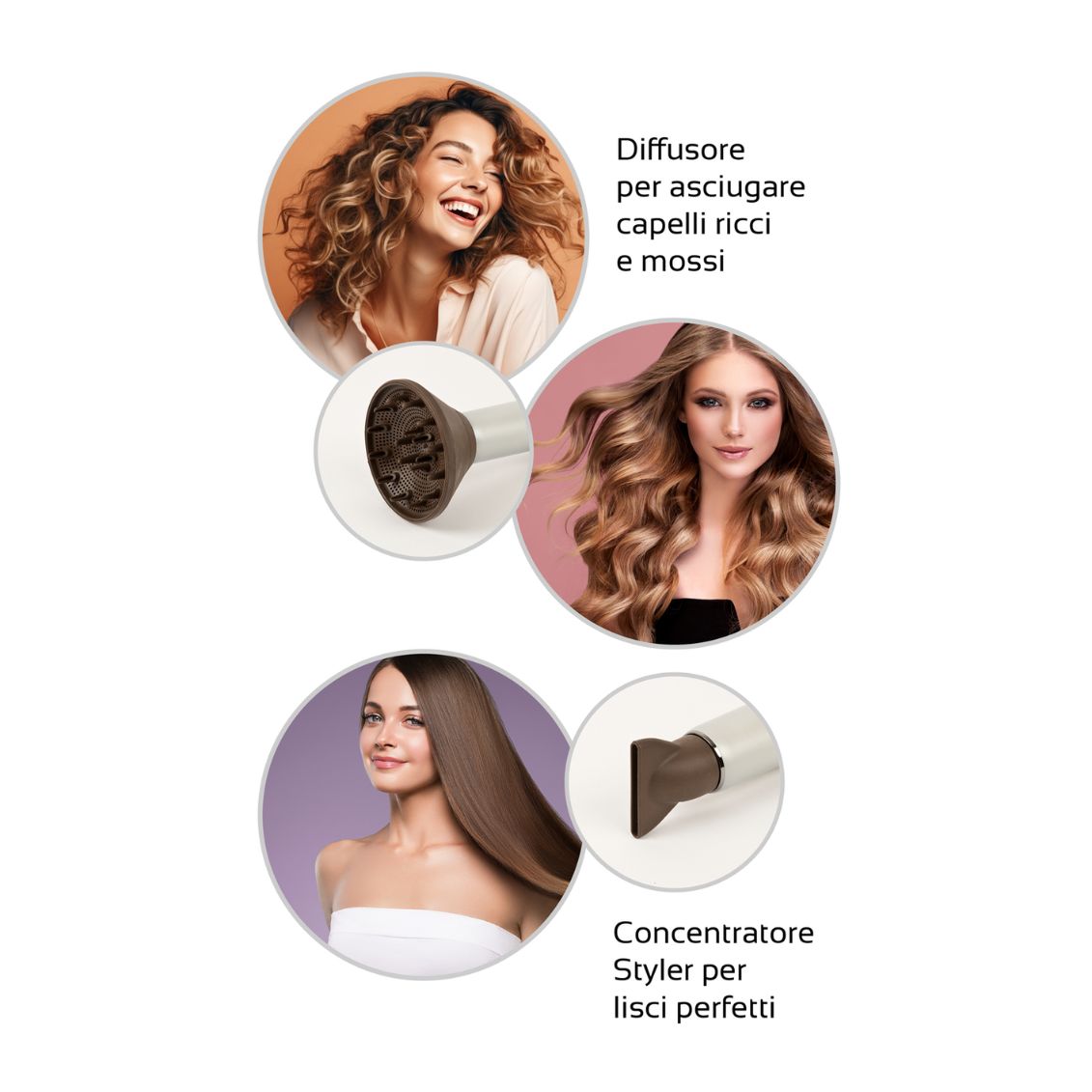 La funzione Ionic contribuisce a rendere i capelli più morbidi e ordinati durante l’asciugatura. In dotazione trovi diffusore per capelli ricci e mossi e concentratore Styler per lisci perfetti, con filtro aria posteriore removibile per una pulizia più semplice; presenti anche funzioni memoria e auto-pulizia.