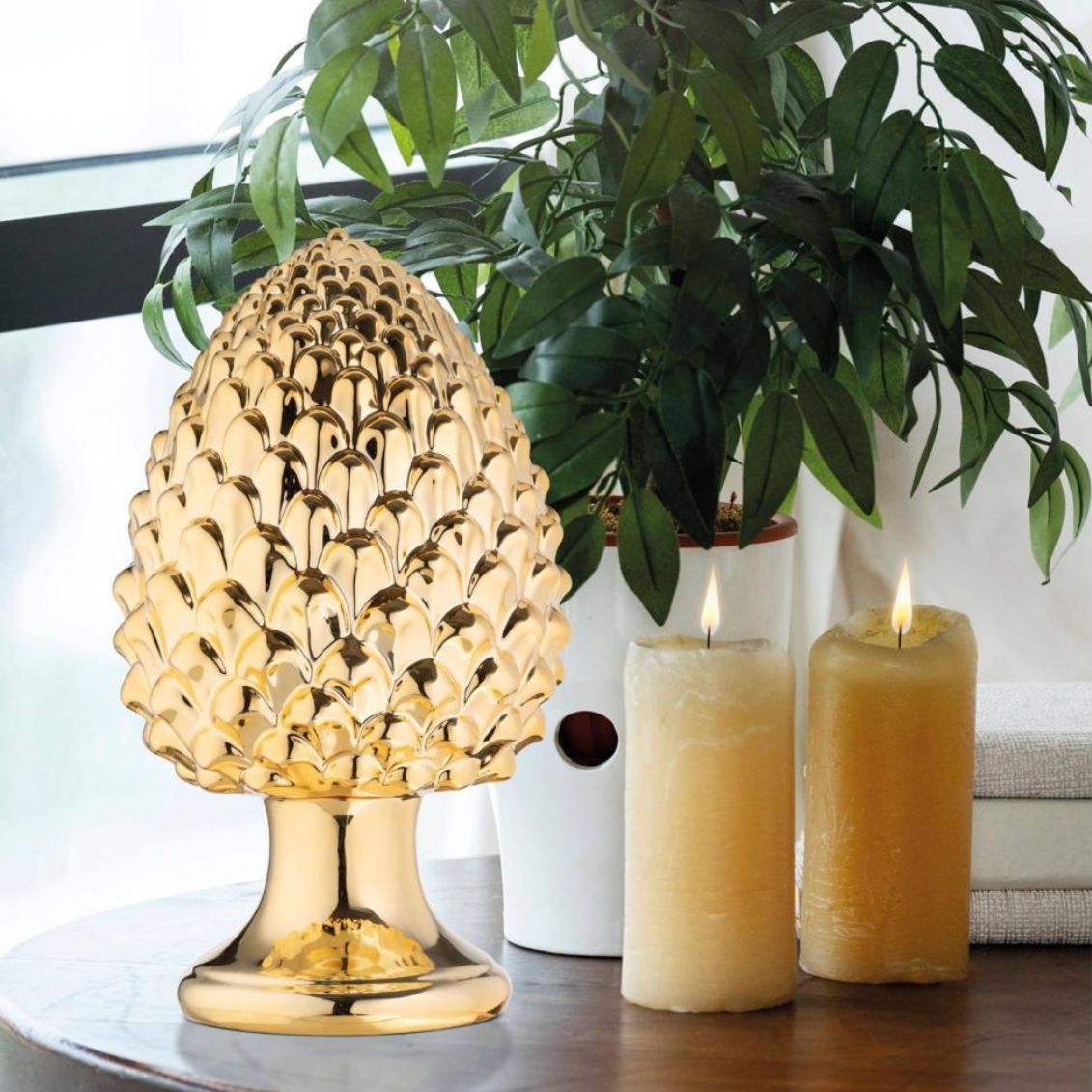 .Pigna ornamentale in ceramica color oro del brand Giardini di Marzo, simbolo di fortuna e prosperità. Alta 8 cm e rifinita con cura nei dettagli, questa decorazione dona un tocco di eleganza e luminosità a qualsiasi ambiente, dal soggiorno all’ingresso. Perfetta come soprammobile, fermacarte o piccola idea regalo beneaugurante.