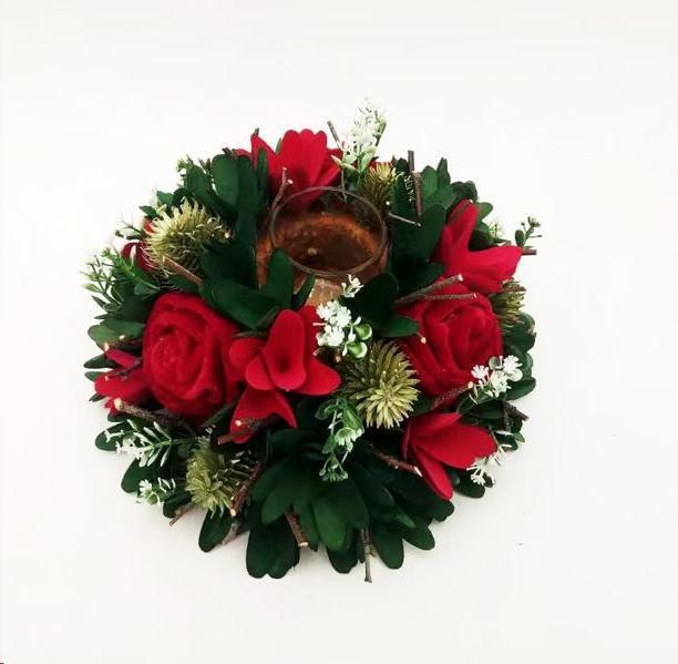 Porta Candela 1Vetro Velluto Rosso-Bacche-Pigne-Fiori. Diam 23 X H 10