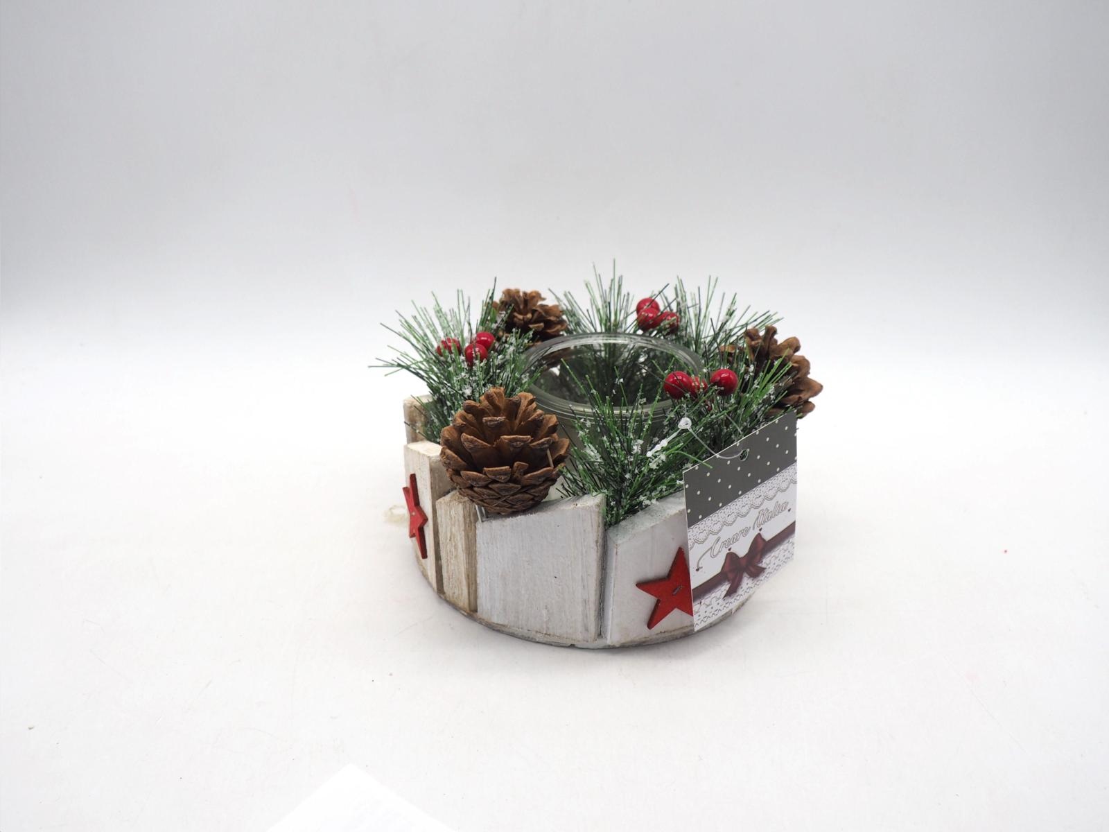 Porta Candela Legno Bianco Nevato C/Pigne/Bacche H12Xd17Cm.C/1Vetri