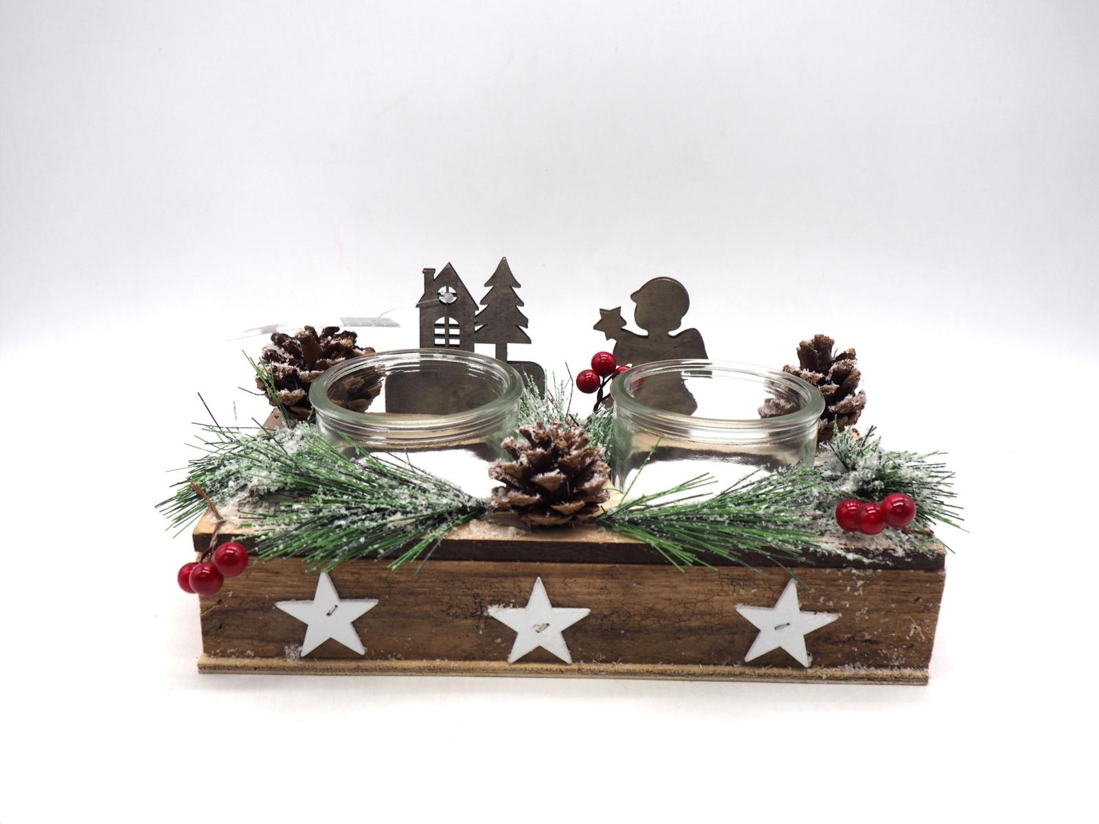 Porta Candela Legno Nevati C/Pigne/Bacche/Casa/Angelo H25X12X7Cm.C/2Vetr