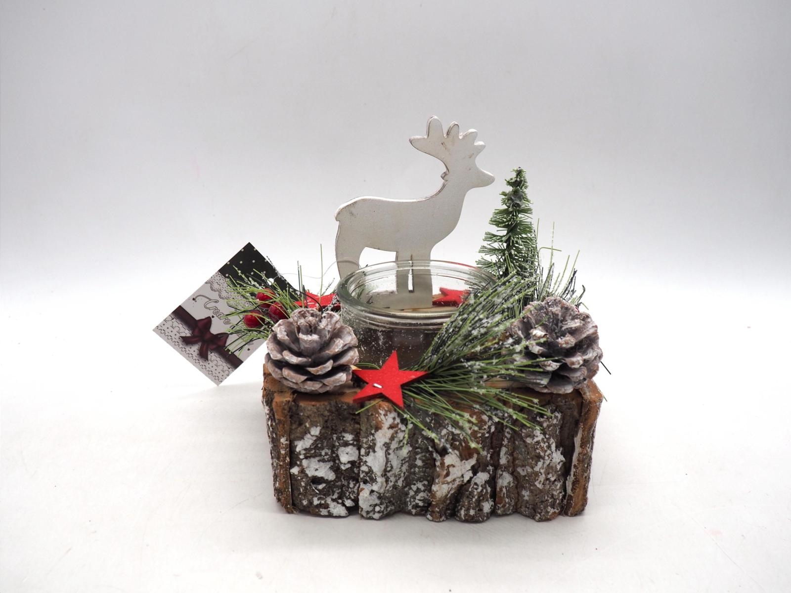 Porta Candela Legno Nevati C/Pigne/Bacche/Renna H16X14X14Cm.C/1Vetri