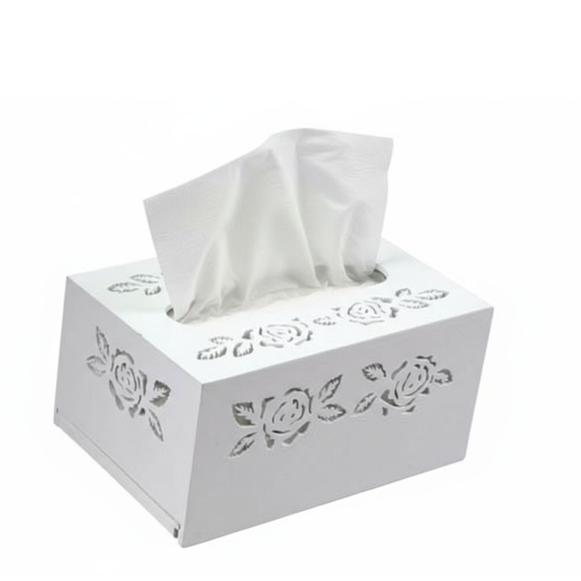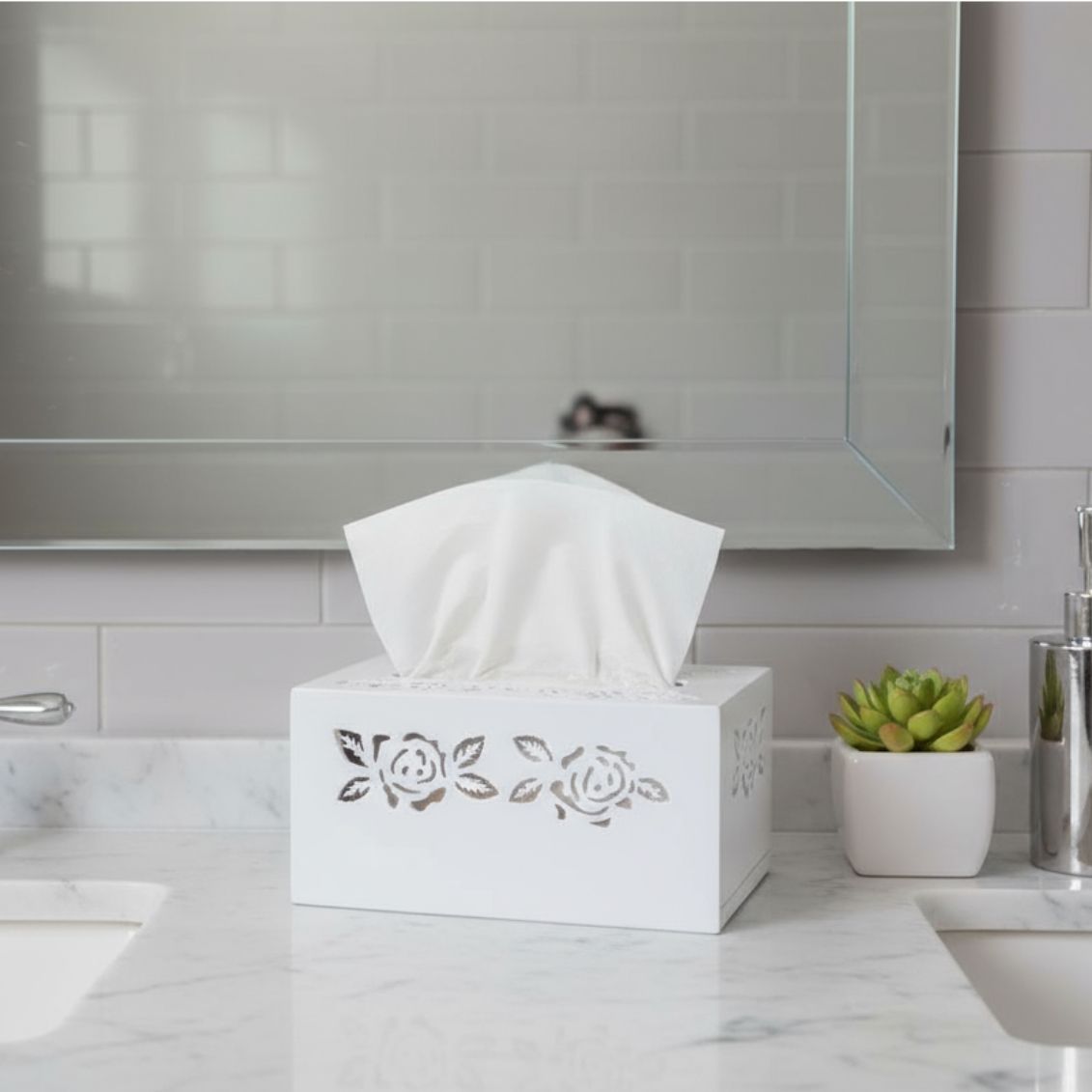 .Elegante porta fazzoletti in legno traforato, finitura bianca, combina funzionalità e design per un tocco raffinato in ogni ambiente.