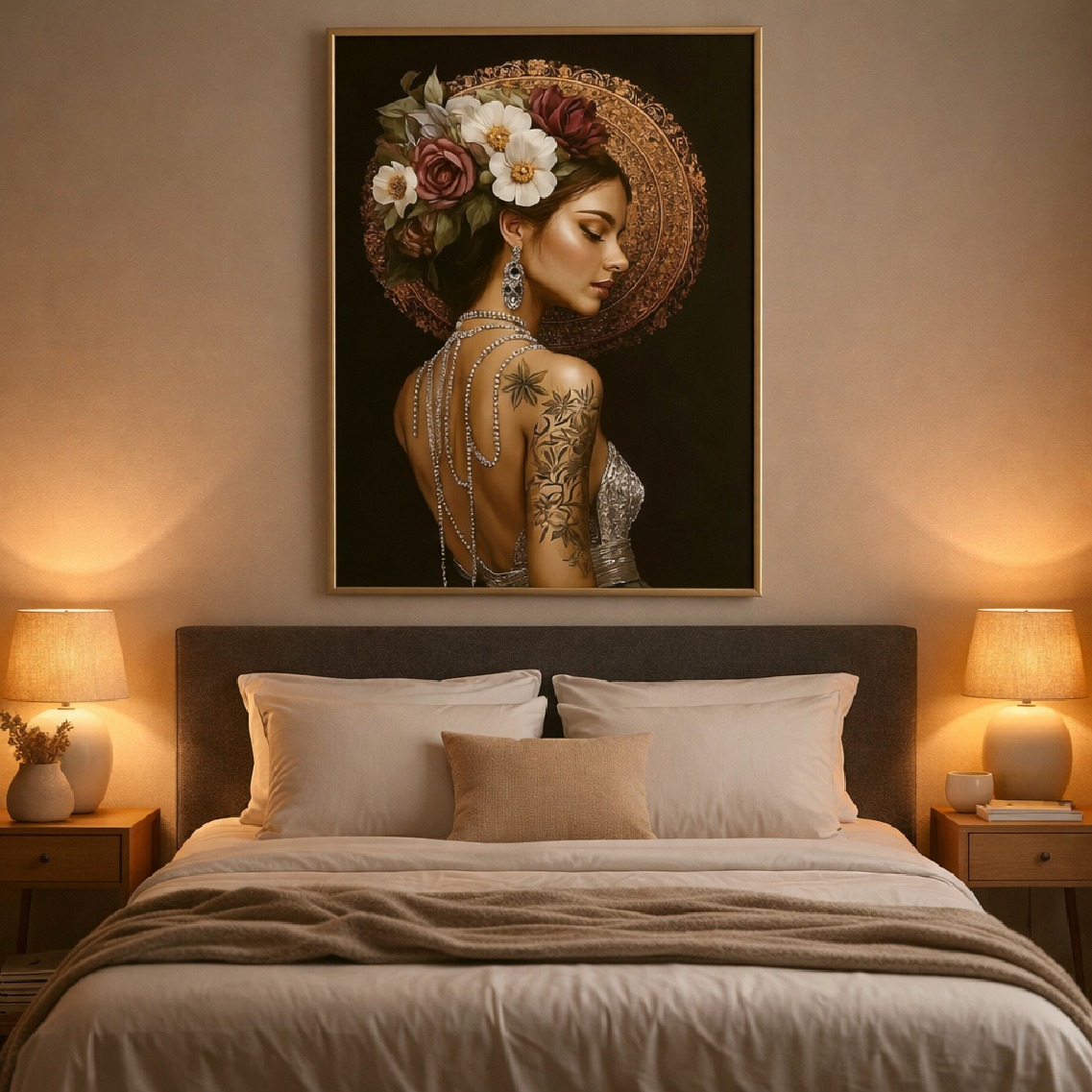 Il Quadro Donna Tatuata Profilo di Giardini di Marzo è una stampa artistica su tela con cornice in legno dorata raffigurante una donna di profilo con fiori bianchi e rossi tra i capelli, gioielli pendenti e tatuaggi floreali sul braccio, su uno sfondo scuro con alone circolare dorato. Le dimensioni di 62x92x3,5 cm ne fanno un elemento di grande presenza scenica, ideale come punto focale in salotti, camere da letto e ingressi. Lo stile figurativo contemporaneo con palette dorata, bordeaux e verde si abbina a interni eleganti e moderni. Un arredo da parete di impatto, adatto anche come regalo per chi ama l'arte decorativa di qualità. Disponibile su Ipershop con spedizione veloce in tutta Italia.