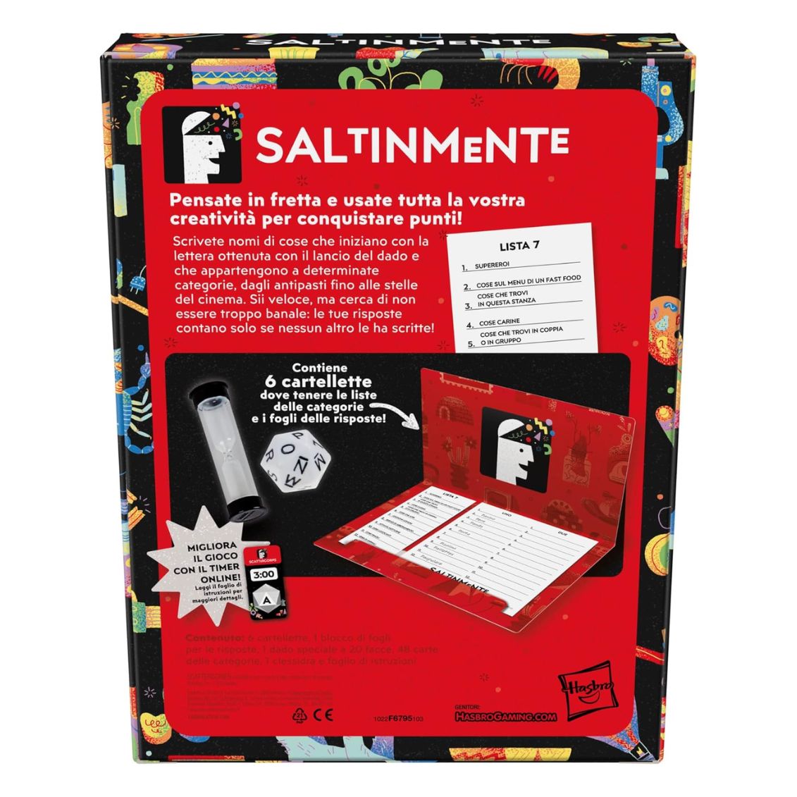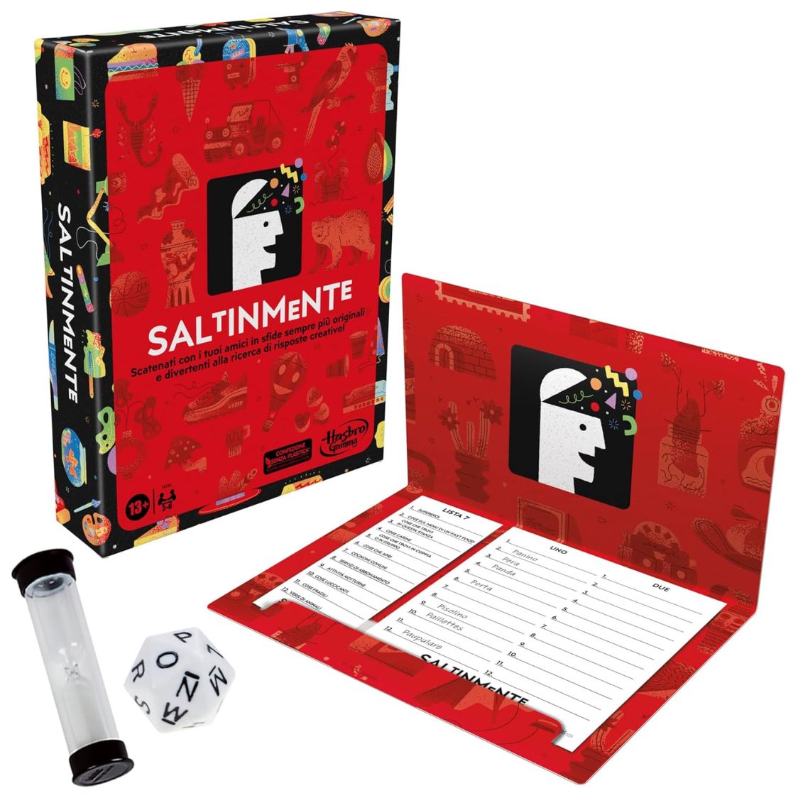 .Il classico gioco di parole e categorie che sfida creatività e velocità! Saltinmente è il celebre gioco da tavolo per 2 o più giocatori dove bisogna trovare parole originali che iniziano con una lettera estratta dal dado, per ogni categoria della lista. Include cartelle rigide per scrivere, dado con lettere, timer e liste con categorie divertenti dagli antipasti alle star del cinema. Vince chi trova le risposte più originali e uniche che nessun altro ha scritto. Potenzia il gioco con strumenti virtuali tramite app. Perfetto per serate in famiglia, feste tra amici o come regalo per appassionati di giochi da tavolo. Età consigliata 13+ anni. Divertimento, risate e sfide di ingegno garantiti!