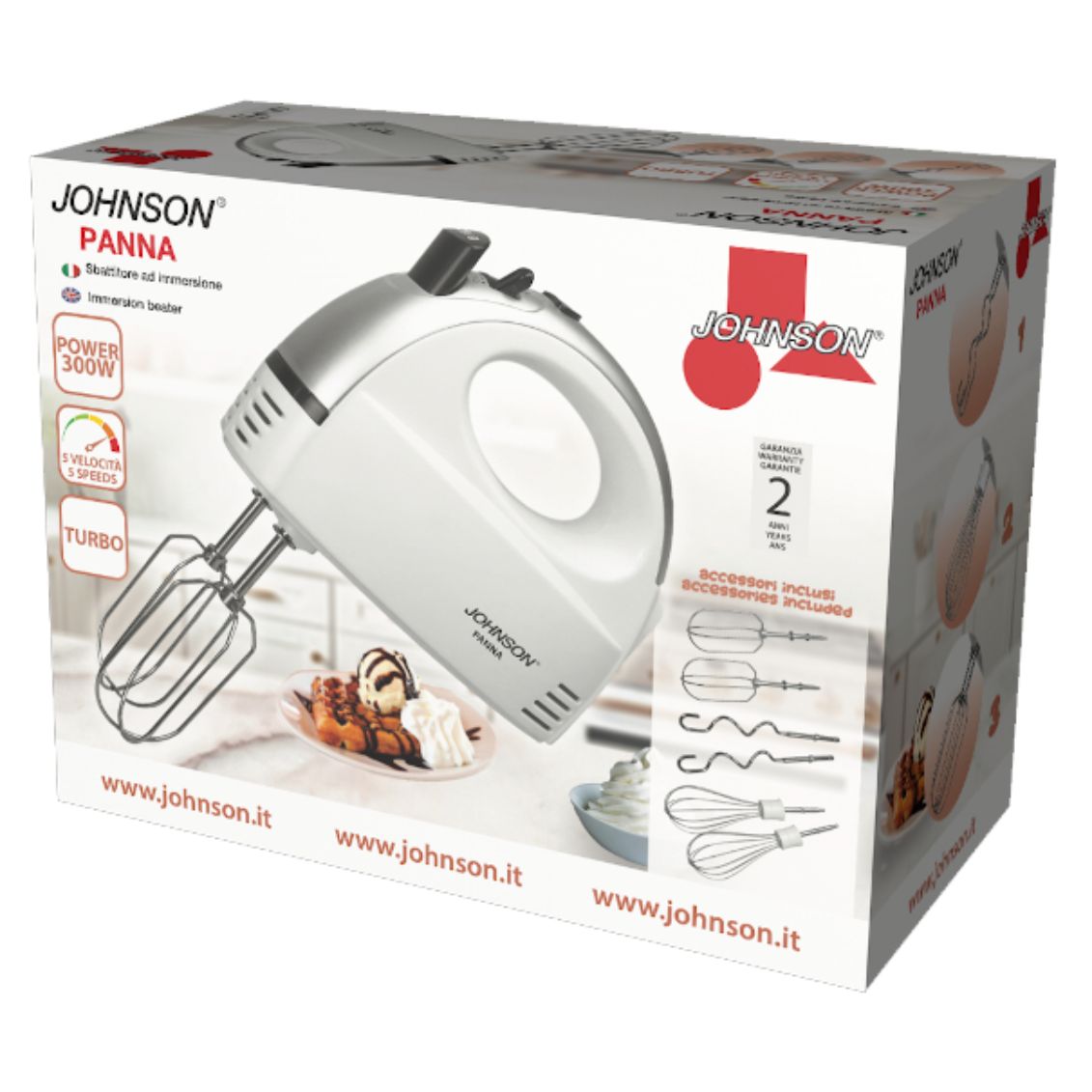 .Sbattitore elettrico PANNA di JOHNSON, compatto e maneggevole, perfetto per tutte le tue esigenze in cucina. Leggero e durevole, facile da usare, è stato realizzato con 5 velocità selezionabili più funzione TURBO e un potente motore da 300W. Fornito di 3 coppie di fruste in acciaio intercambiabili per ogni preparazione: frusta a spirale per impasti più compatti come pane e pizza, frusta per miscelare e amalgamare impasti più morbidi come torte e biscotti, frusta a filo per montare a neve albumi e panna. Dotato di pratico pulsante per espulsione automatica delle fruste. PANNA è lo sbattitore ad immersione che ti farà risparmiare tempo prezioso in cucina con risultati professionali.
