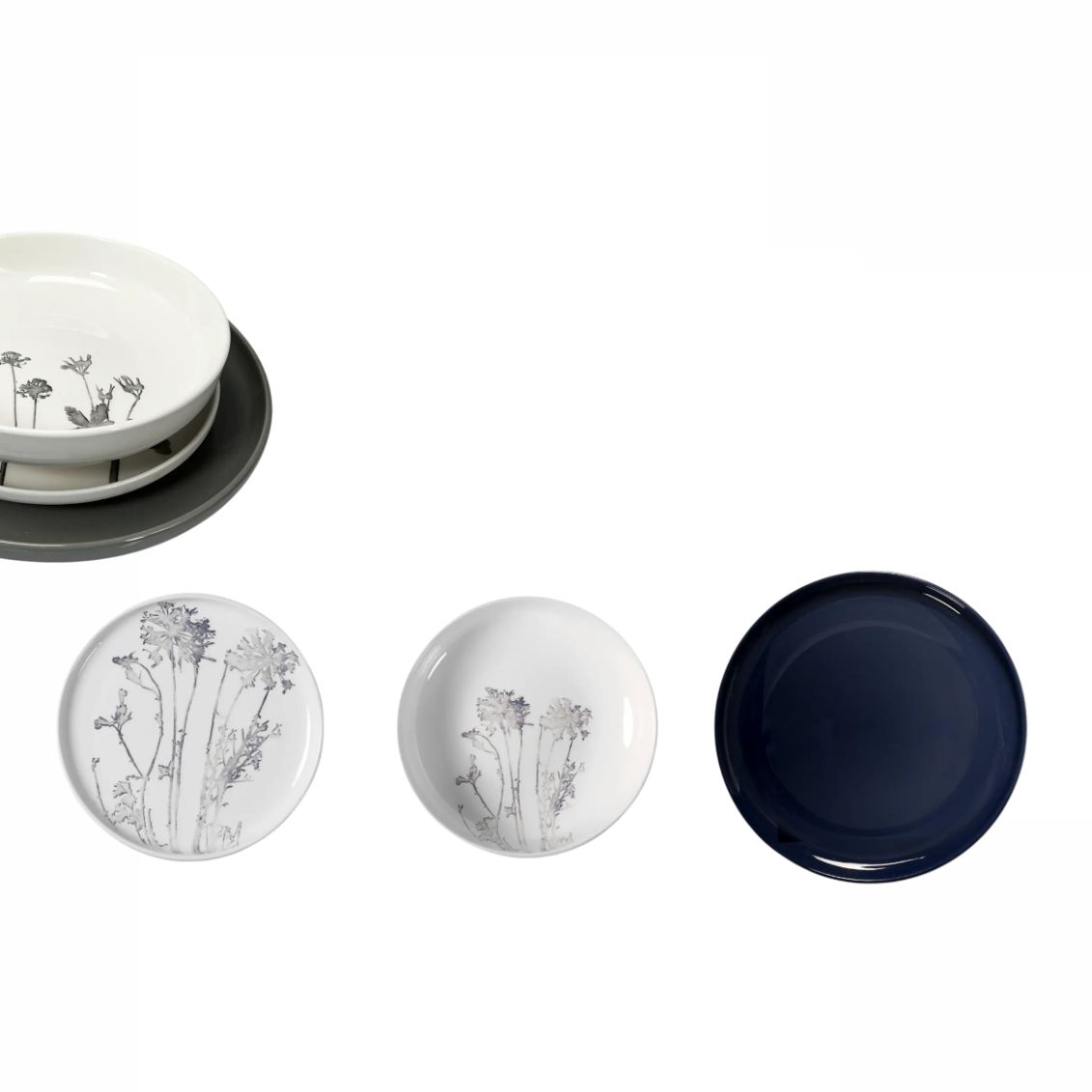 Il servizio presenta una decorazione botanica sofisticata ispirata alla bellezza silente e poetica di un giardino d'inverno, interpretata nell'elegante tonalità blu. Il motivo delicato e affascinante evoca la natura nella sua forma più contemplativa, con elementi floreali e vegetali stilizzati che creano un'atmosfera di eleganza naturale. La palette cromatica blu intenso richiama il cielo invernale sereno, i fiori freddi come ortensie e iris, e le atmosfere nordiche che conferiscono profondità e carattere alla tavola. Le decorazioni botaniche riproducono foglie, rami e elementi naturali con tratto raffinato che aggiunge un tocco di arte contemporanea trasformando ogni pasto in un'esperienza estetica sofisticata.