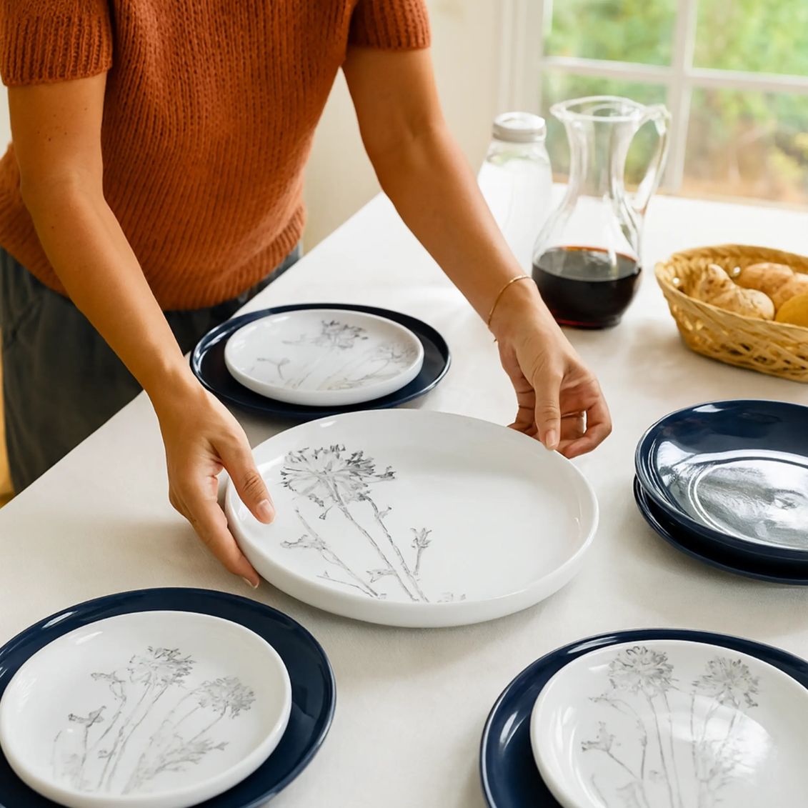 Il blu dei piatti piani si abbina magnificamente con tovagliati di lino naturale grezzo per uno stile scandinavo-mediterraneo, con tovaglie bianche candide per contrasti eleganti e formali, con tessuti beige e tortora per atmosfere calde e accoglienti, con tovaglie grigie per composizioni contemporanee monocromatiche sofisticate. Le decorazioni botaniche blu sui piatti bianchi permettono di inserire elementi naturali come rami, foglie e fiori freschi che dialogano con il motivo. Posate in acciaio satinato o cromato lucido completano l'apparecchiatura moderna, mentre bicchieri trasparenti o leggermente affumicati mantengono leggerezza visiva lasciando protagonista il blu intenso dei piatti.
