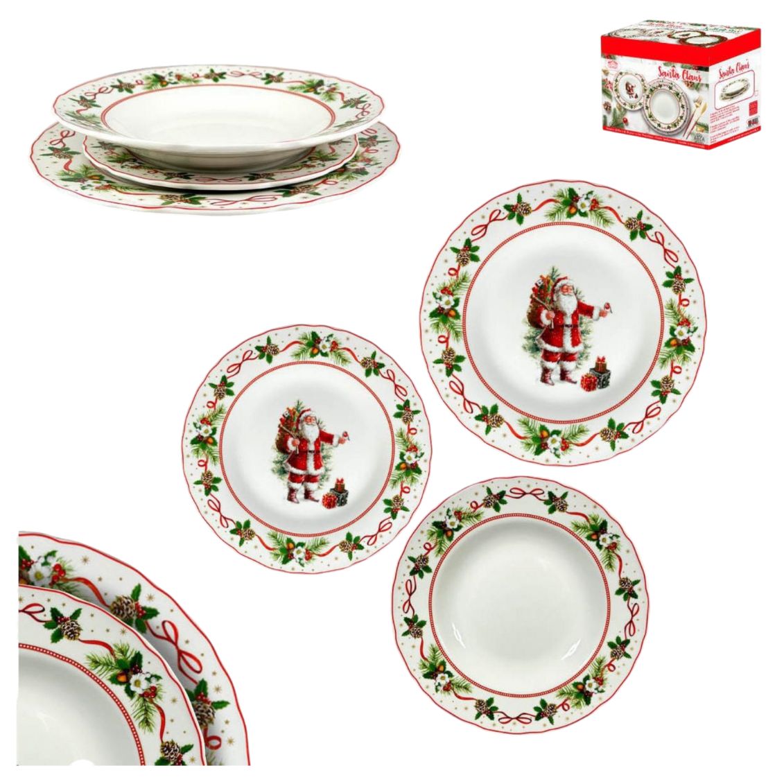 .Porta la magia di Babbo Natale in tavola! Il set da 18 pezzi con decorazioni a tema Santa Claus unisce eleganza e funzionalità, perfetto per servire ogni portata durante le feste con uno stile raffinato.