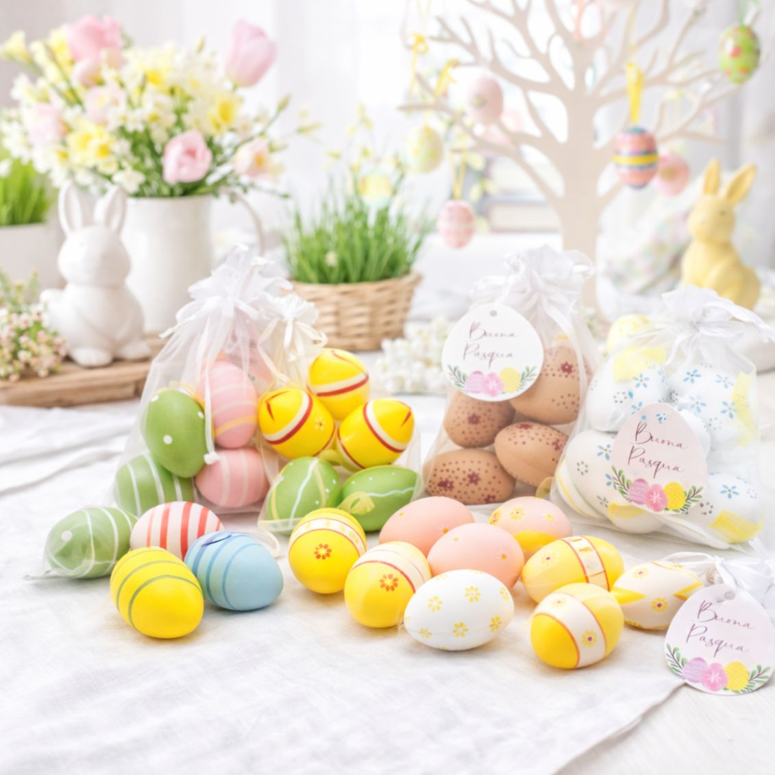 Questo set si distingue per la cura del packaging e la varietà dei dettagli. A differenza dei soliti blister in plastica usa e getta, la pregiata bustina in organza non solo dona valore immediato al prodotto facendolo sembrare una vera e propria bomboniera, ma ti permette di conservare gli ovetti in ordine anno dopo anno. I pattern decorativi dipinti sulle uova trasmettono allegria e cura artigianale, trasformando un semplice oggetto in una decorazione d'impatto per il tuo salotto o la tua cucina.