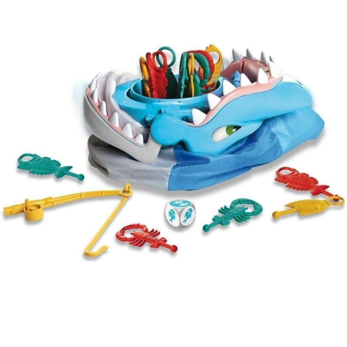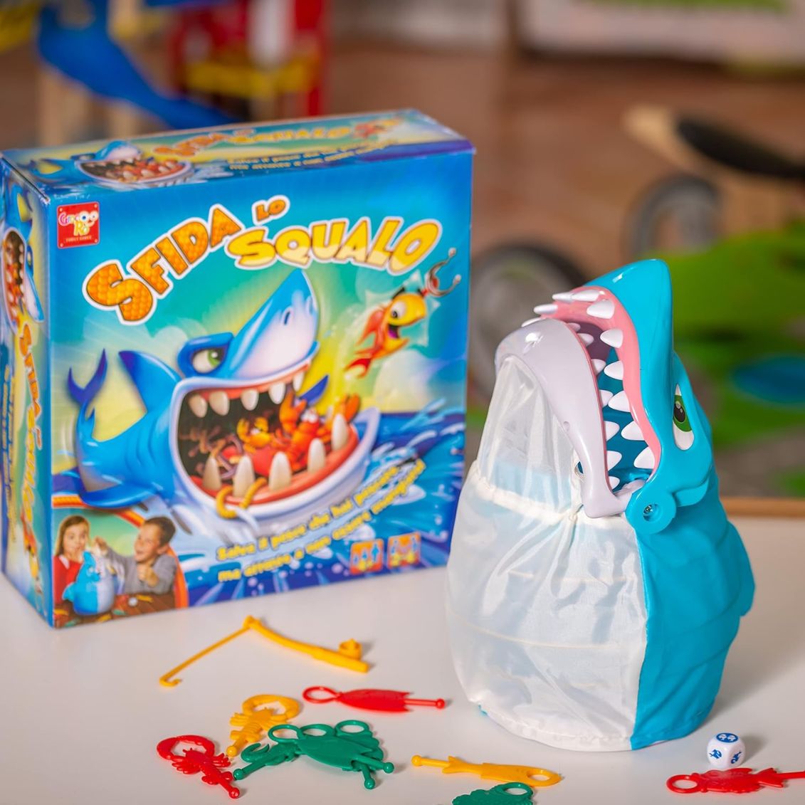 Posiziona lo squalo al centro del tavolo con tutti i pesciolini nella sua bocca spalancata. Ogni giocatore riceve una canna da pesca. A turno, lancia il dado e pesca dalla bocca dello squalo il numero di pesciolini indicato dal dado, ma fai attenzione: in qualsiasi momento lo squalo può scattare chiudendo la bocca e "mordendo" la canna! Usa delicatezza e precisione per agganciare i pesciolini con l'amo magnetico senza svegliare lo squalo affamato. Il gioco termina quando tutti i pesciolini sono stati pescati. Vince chi ne ha catturati di più! Il meccanismo imprevedibile dello squalo mantiene alta la tensione ad ogni turno, creando momenti esilaranti di suspense e sorpresa. Perfetto per 2-4 giocatori dai 4 anni in su.