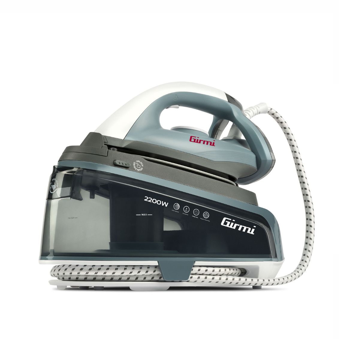 .Sistema stirante continuo professionale Girmi SS04 potenza 2200W, serbatoio 1500cc rabbocco continuo stiratura illimitata non-stop, pressione vapore 3 bar costante, piastra ceramica Slalom Glide alto scorrimento, dotato di volume vapore regolabile Eco 50 g/min Max 100 g/min, vapore continuo verticale rinfrescare tessuti, termostato regolabile temperature tessuti diversi, filtro anticalcare intercambiabile ricambio SS05, funzione Self-Clean manutenzione, indicatori luminosi funzionamento, avvolgicavo sistema blocco ferro. Dimensioni compatte 34x27x20 cm peso 2.7 kg. Grigio bianco elegante. Stiratura efficiente rapida professionale.
