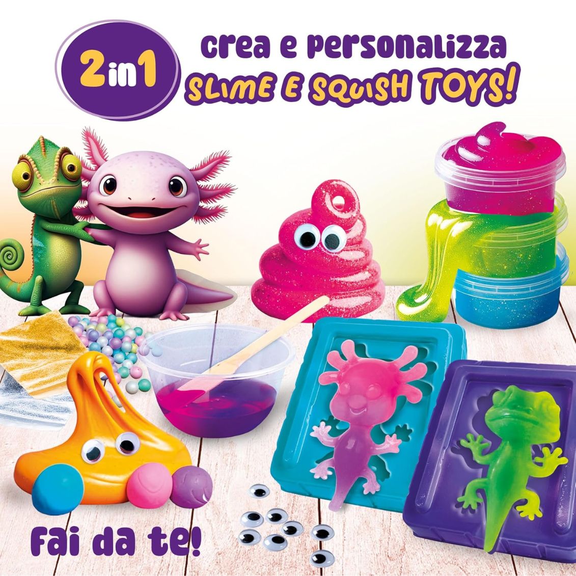 Creazioni possibili: 2 squishy toys (axolotl e camaleonte) + 5 tipi di slime diversi