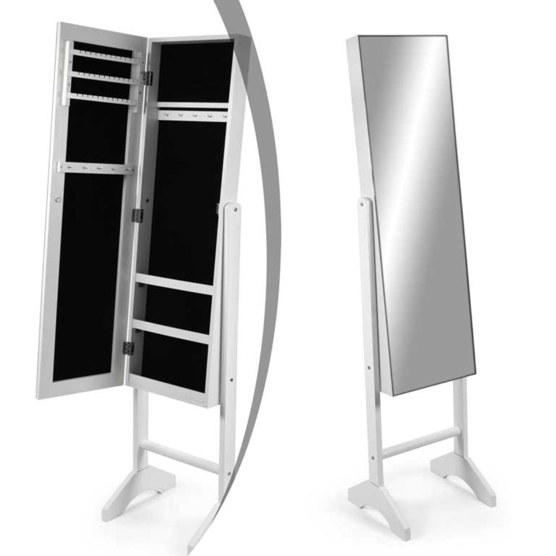 Posiziona la specchiera da terra con contenitore in camera da letto o nella cabina armadio. La superficie specchiante frontale è disponibile in qualsiasi momento; apri l'anta per accedere al vano interno e organizzare collane, bracciali, anelli e orecchini nei ripiani e ganci dedicati.