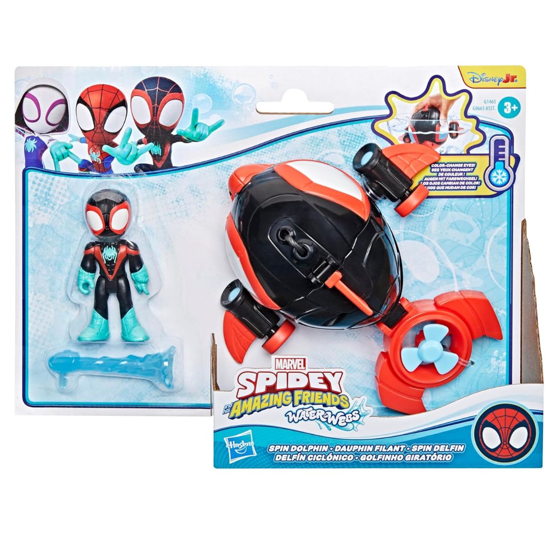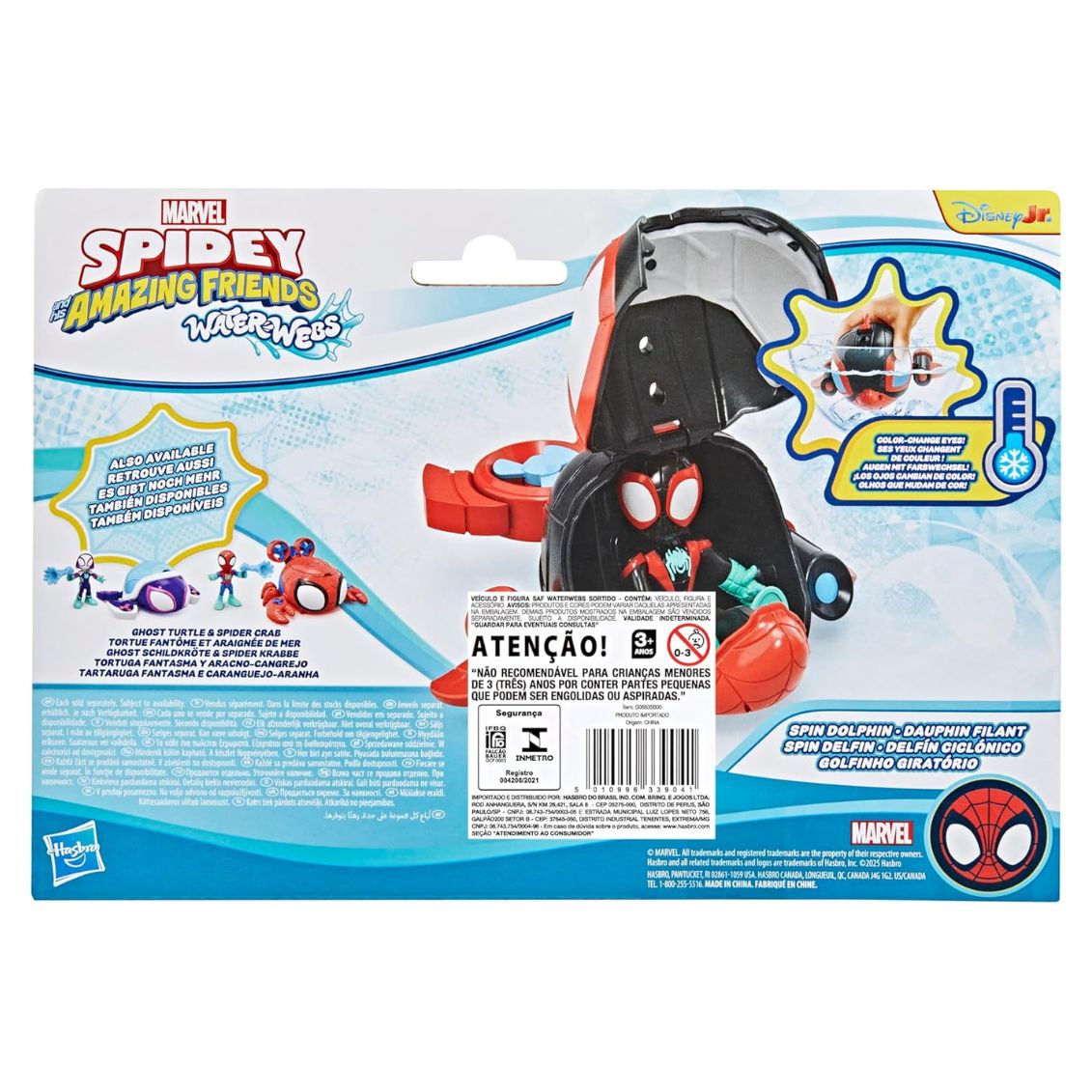 .Sottomarino Spin Dolphin con effetto cambia-colore e Miles "Spin" Morales! Questo fantastico playset acquatico include il veicolo sottomarino giocattolo da 7,6cm con occhi che cambiano colore da bianco a blu quando immerso in acqua fredda, più l'action figure snodabile di Miles Morales in costume Water-Webs con accessorio ragnatela rimovibile. Ispirato alla serie Disney Junior Spidey and His Amazing Friends, questo set è perfetto per ricreare avventure subacquee mozzafiato e stimolare il gioco immaginativo nei bambini in età prescolare.