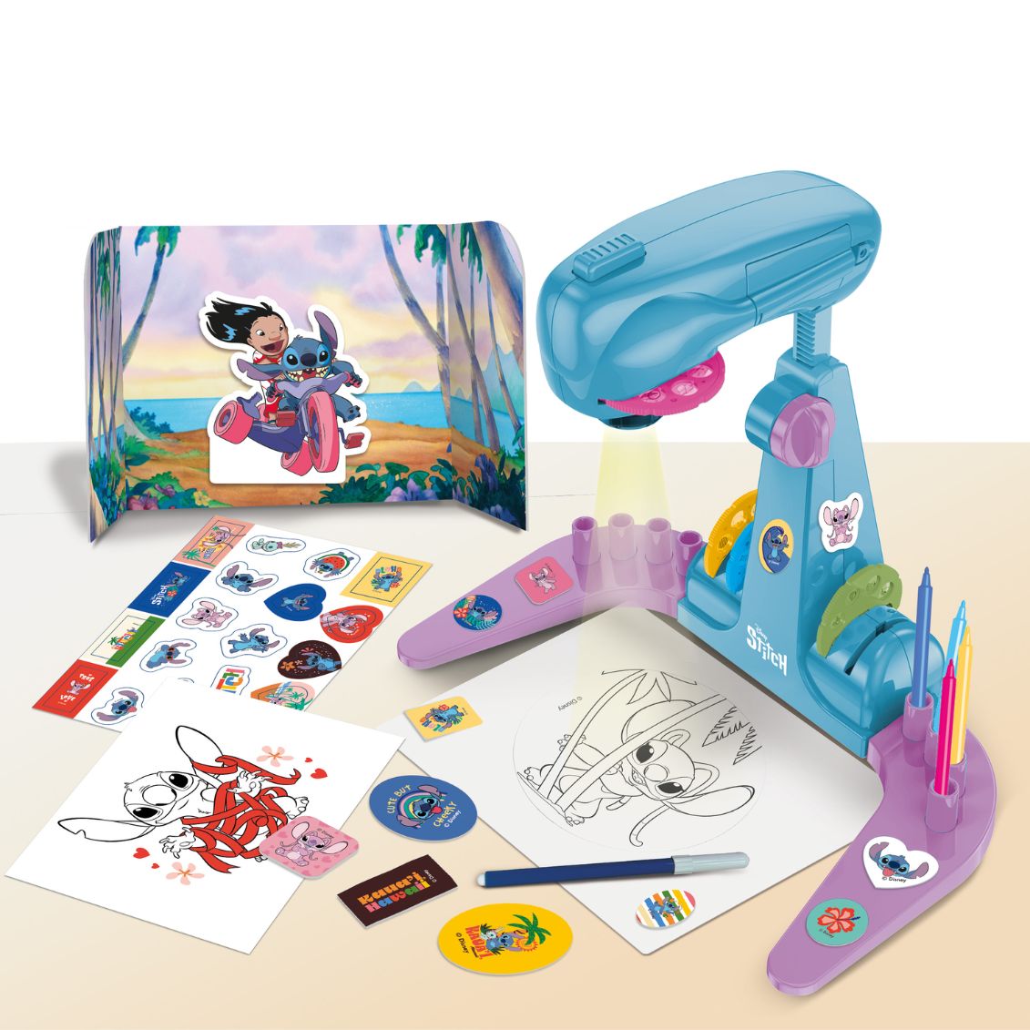 Impara a disegnare con il proiettore di Stitch! Grazie al proiettore personalizzato, 4 dischetti con 32 immagini da ricalcare, pennarelli colorati, diamantini e stickers, potrai creare disegni unici in modo facile e divertente.