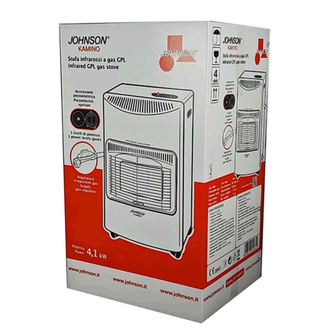 .Calore potente per ambienti ampi! Kamino di Johnson è una stufa a gas GPL infrarossi con 3 piastre ceramiche ad alta capacità di riscaldamento fino a 120 m². Potenza regolabile 3 livelli (1400-2800-4200W) tramite selettore. Accensione piezoelettrica, maniglie laterali per spostamento. Bombola 10-15 kg alloggiata internamente (NON inclusa). Include regolatore pressione, tubo gas e fascette. Dispositivi sicurezza: spegnimento automatico se fiamma accidentale e rilevazione CO2. Certificata SGS. Per ambienti fino a 200 m³ ben areati.
