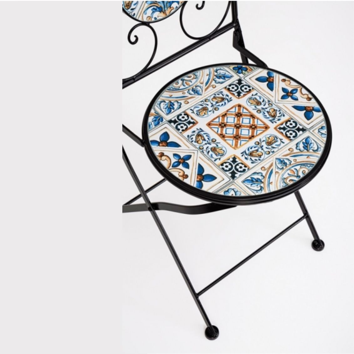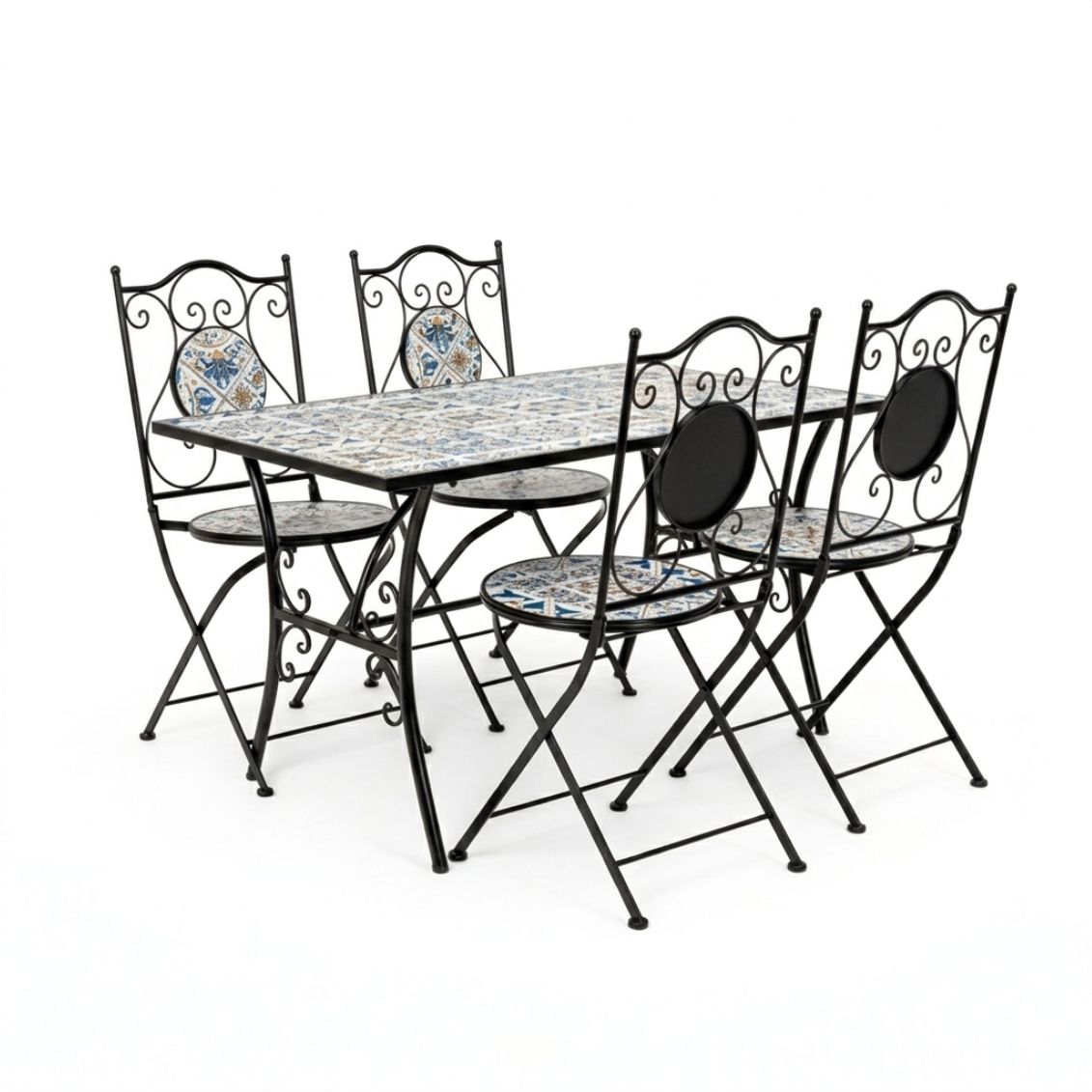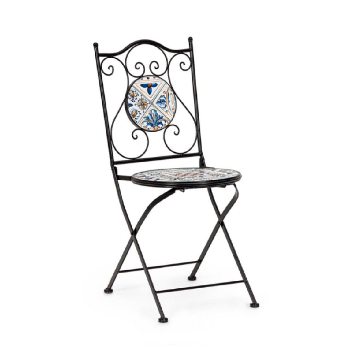 Il set Mykonos è pensato per chi vuole arredare un giardino o una terrazza con un tocco di stile mediterraneo, senza rinunciare alla resistenza necessaria per l’uso in esterno. Le decorazioni in maiolica colorata rendono ogni pezzo unico e riconoscibile, mentre le linee arricciate della struttura in acciaio richiamano le lavorazioni tradizionali in ferro battuto. Le sedie pieghevoli sono un vantaggio pratico: si ripongono facilmente in poco spazio quando il set non viene utilizzato. La struttura trattata con e-coating e verniciatura epossidica garantisce protezione dalla ruggine e una lunga durata anche in condizioni climatiche variabili.