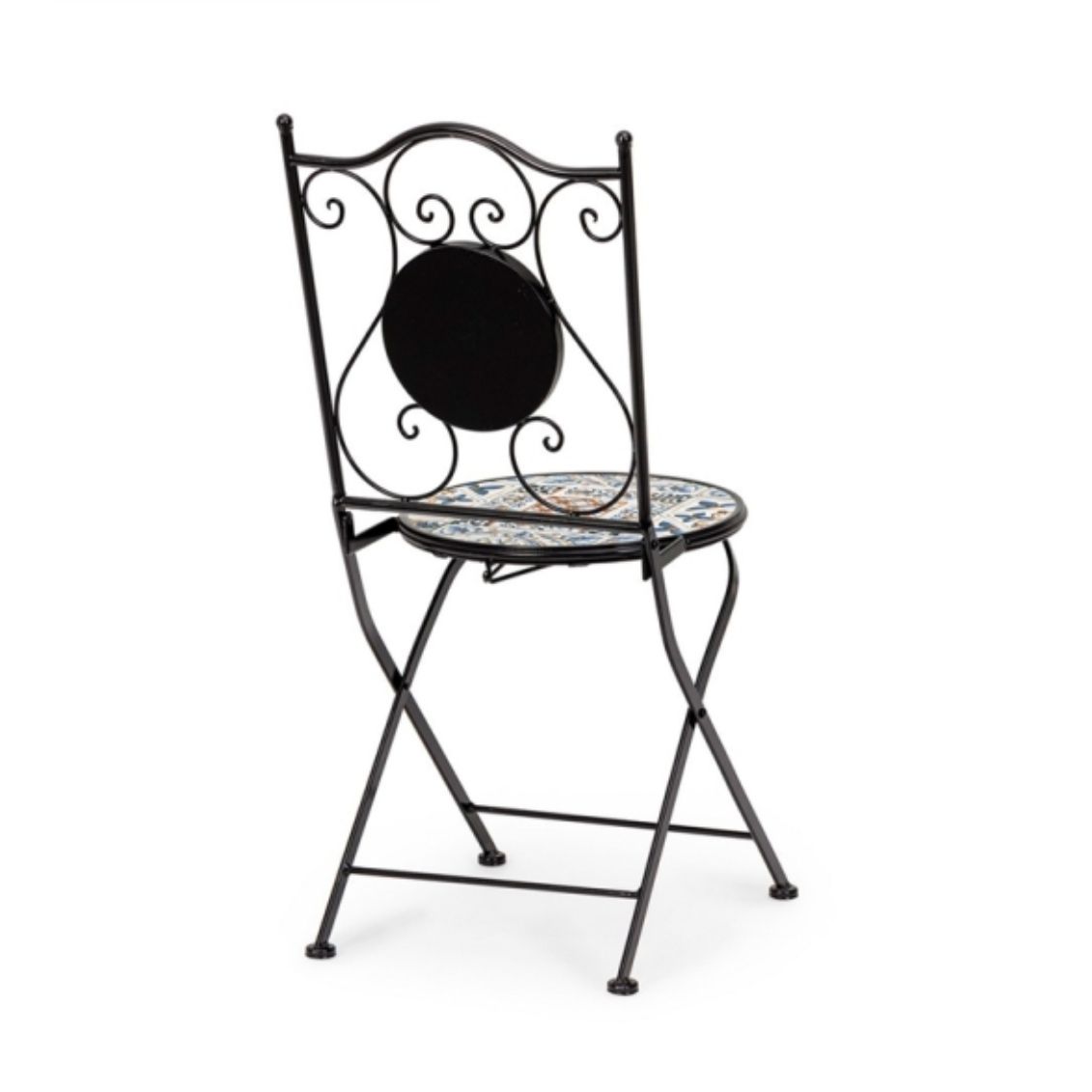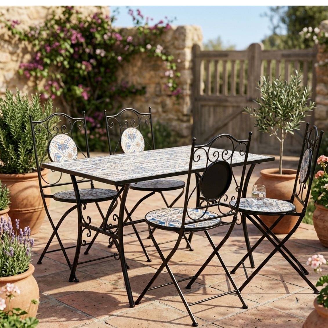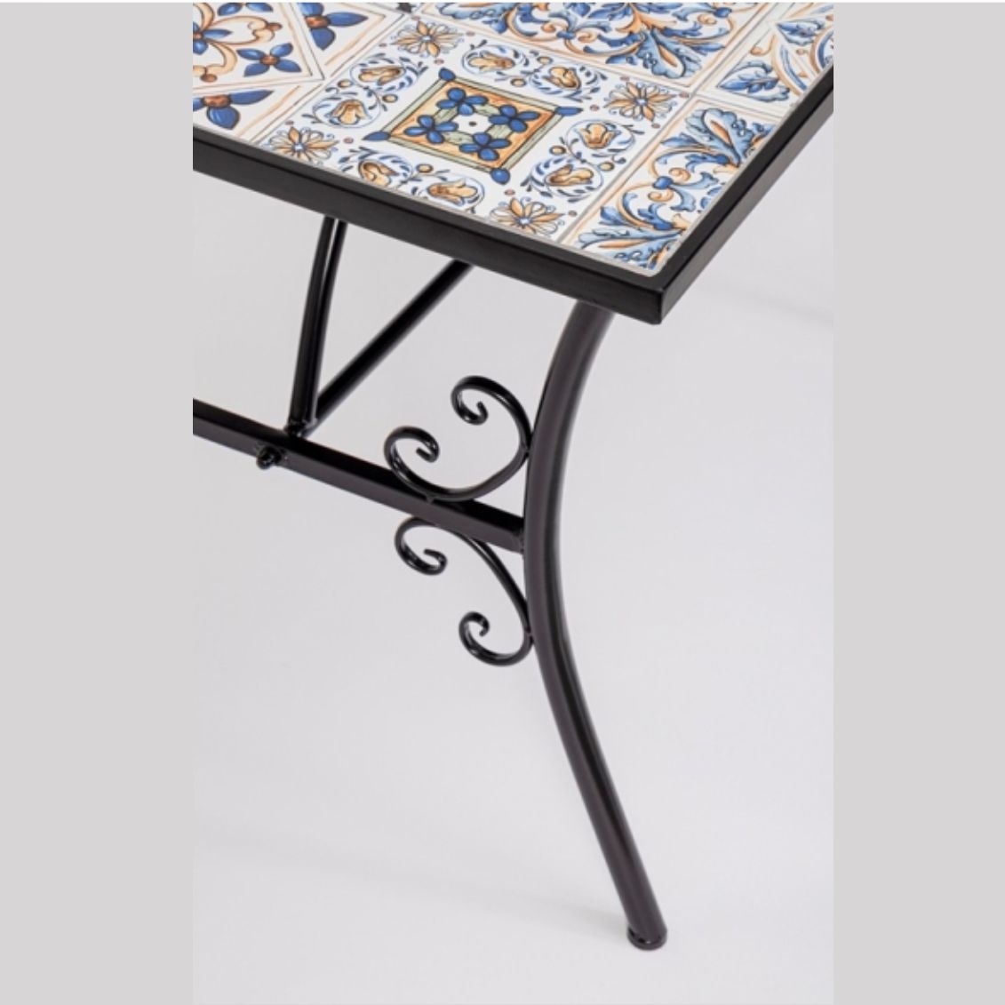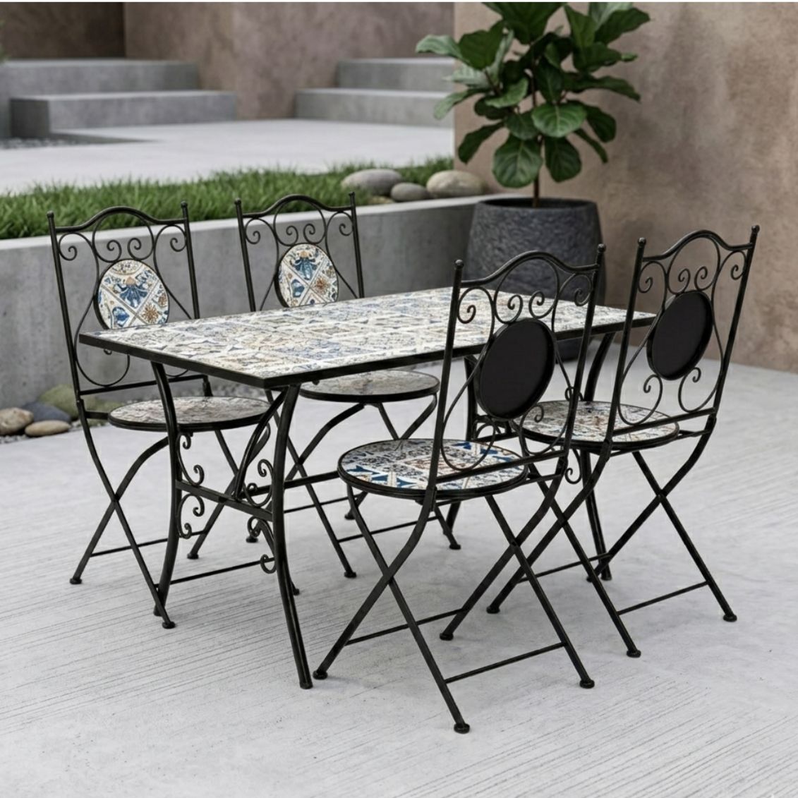 Il set Mykonos è pensato per chi vuole arredare un giardino o una terrazza con un tocco di stile mediterraneo, senza rinunciare alla resistenza necessaria per l’uso in esterno. Le decorazioni in maiolica colorata rendono ogni pezzo unico e riconoscibile, mentre le linee arricciate della struttura in acciaio richiamano le lavorazioni tradizionali in ferro battuto. Le sedie pieghevoli sono un vantaggio pratico: si ripongono facilmente in poco spazio quando il set non viene utilizzato. La struttura trattata con e-coating e verniciatura epossidica garantisce protezione dalla ruggine e una lunga durata anche in condizioni climatiche variabili.