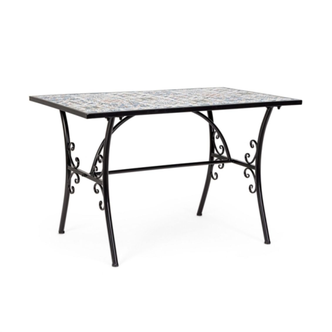Bizzotto Mykonos è un set da pranzo per esterni composto da un tavolo rettangolare 120x80x75 cm e 4 sedie pieghevoli, entrambi in acciaio trattato con e-coating ed epossidico, decorati con maioliche in ceramica a fantasia colorata in stile mediterraneo. Codice articolo tavolo: 805745 – sedie: 805748.