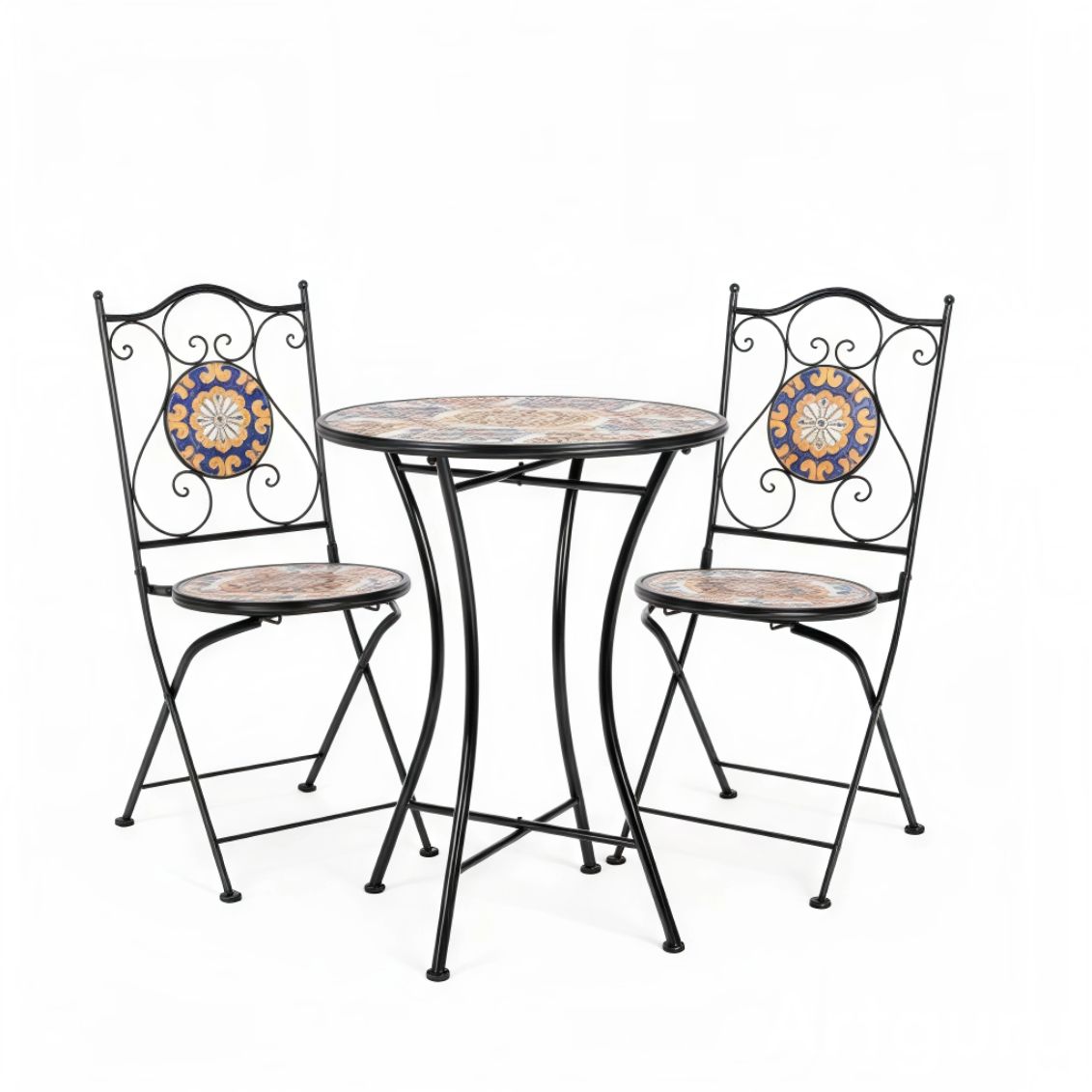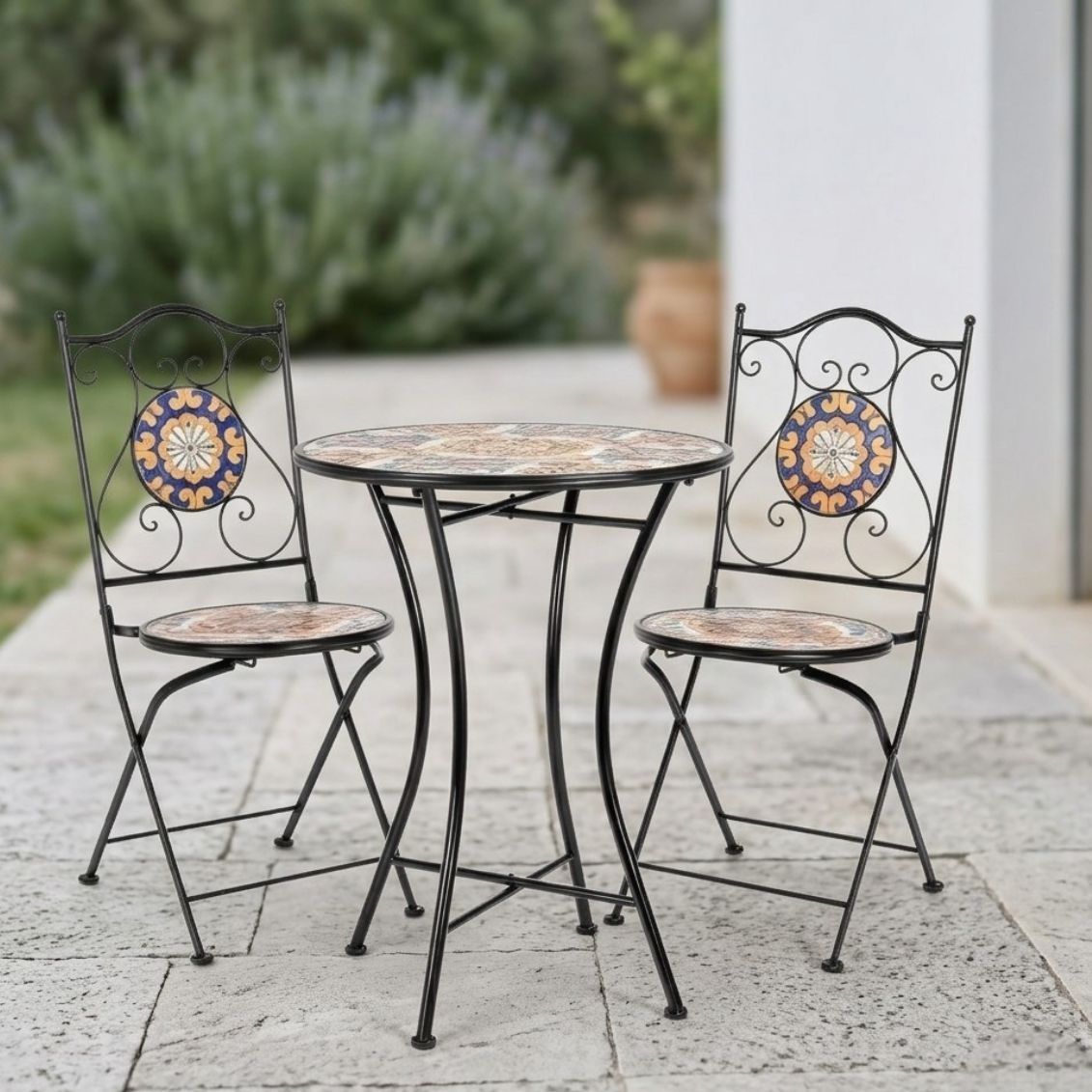 .Il set bistrot Santorini di Bizzotto è la scelta perfetta per arredare con eleganza mediterranea piccoli spazi all'aperto, come balconi, verande o intimi angoli del giardino. Composto da un tavolo rotondo con diametro di 60 cm e due pratiche sedie pieghevoli, questo salottino da esterno unisce stile classico e funzionalità. La solida struttura in acciaio è appositamente trattata per l'esterno tramite e-coating e verniciatura a polvere epossidica, garantendo un'eccellente resistenza alla ruggine e alle intemperie. Il vero elemento di spicco del set è la decorazione in ceramica: il piano del tavolo e gli inserti sugli schienali delle sedie presentano splendide maioliche a fantasia colorata, che donano un tocco artistico e raffinato. Le linee sinuose della struttura, che richiamano la classica lavorazione del ferro battuto, lo rendono perfetto per godersi colazioni o aperitivi all'aria aperta in totale relax. Disponibile su Ipershop con spedizione veloce in tutta Italia.
