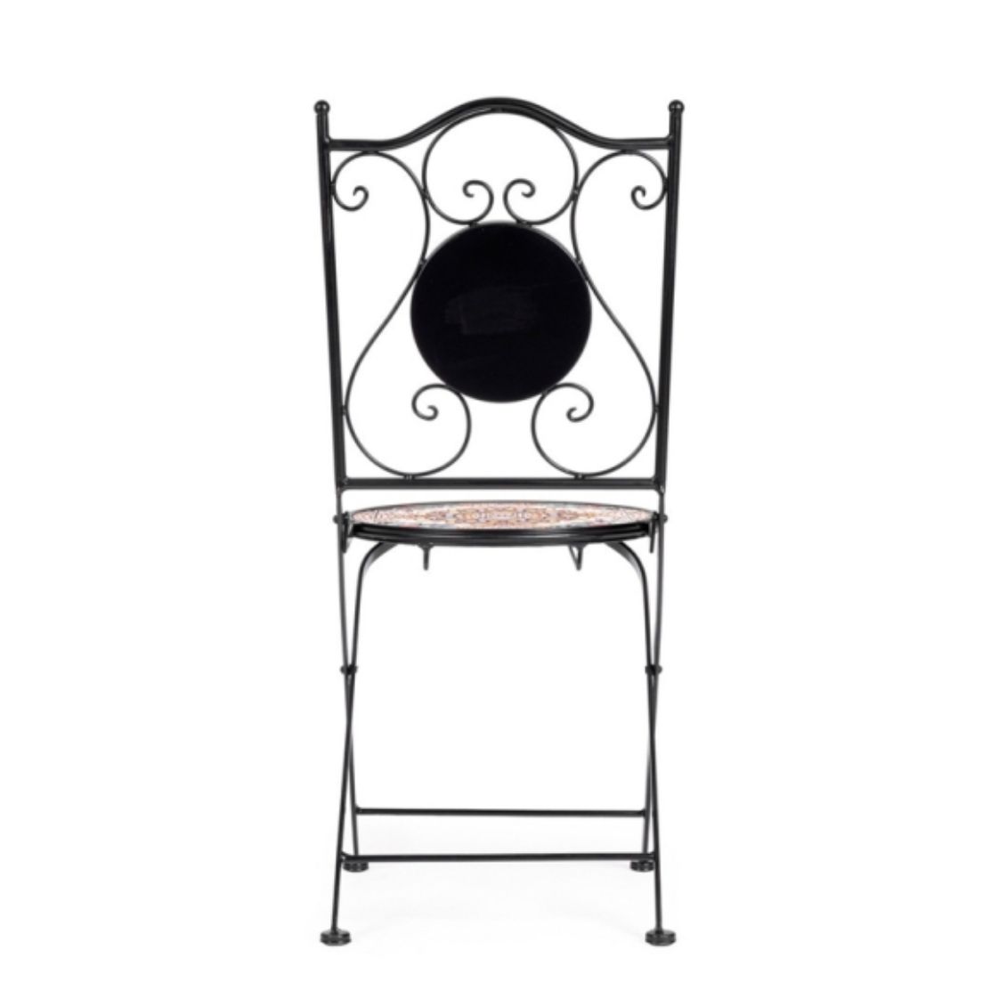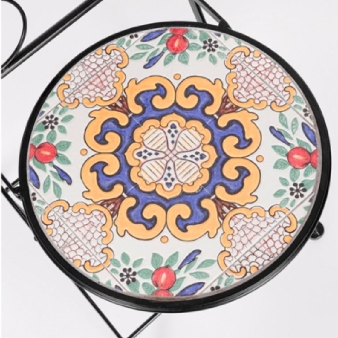 Il Set Bistrot Santorini Bizzotto è un elegante salottino per esterni in stile classico, composto da un tavolo tondo Ø60 cm e due sedie pieghevoli, con struttura in acciaio trattato e decorazioni in ceramica stile maiolica. Codice articolo: 805081.