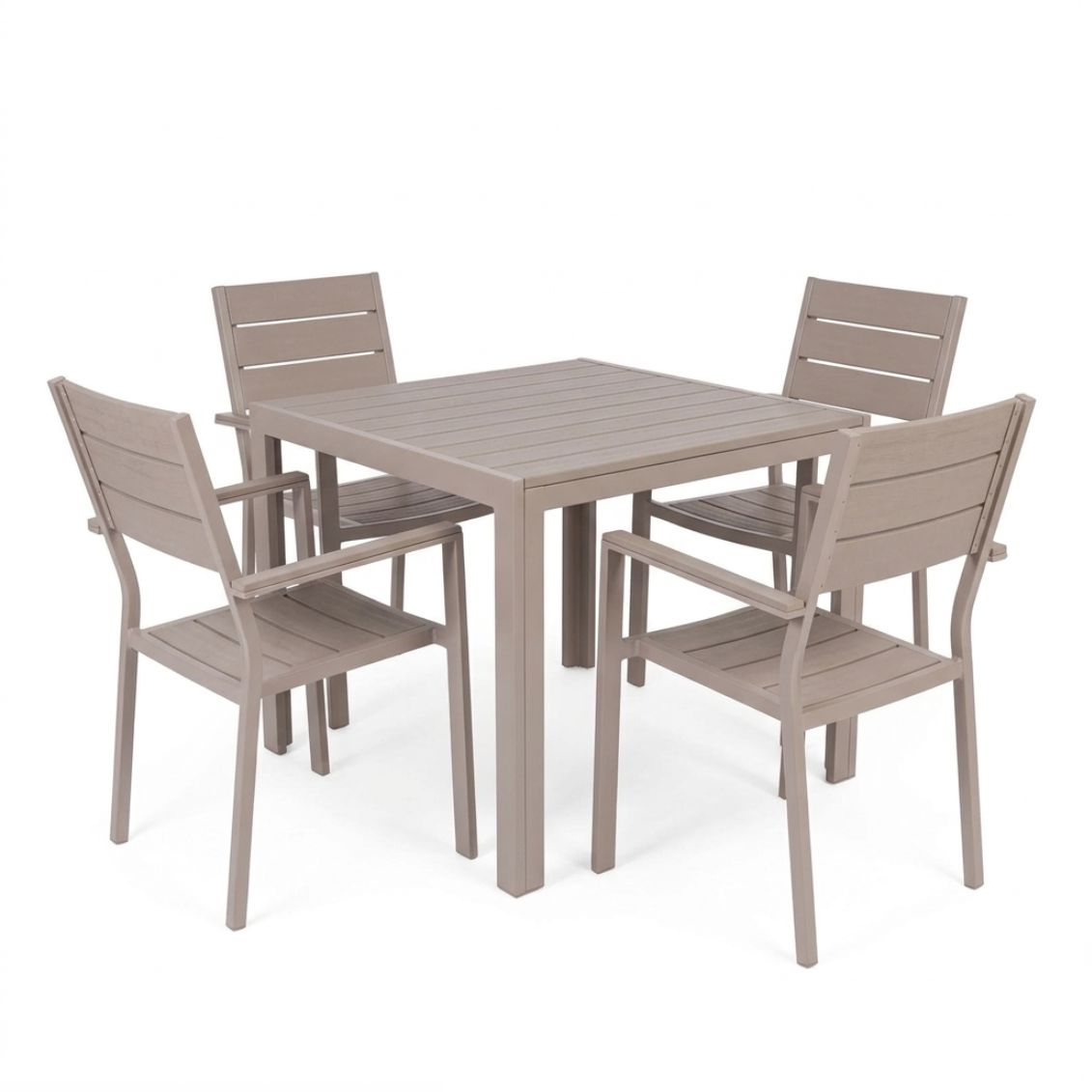 Il Set Sarita Bizzotto è un set da pranzo per esterno color tortora, composto da un tavolo quadrato 78x78 cm e 4 sedie impilabili con braccioli, realizzati in acciaio e HDPE effetto legno. Codici articolo: 650065 / 650061.