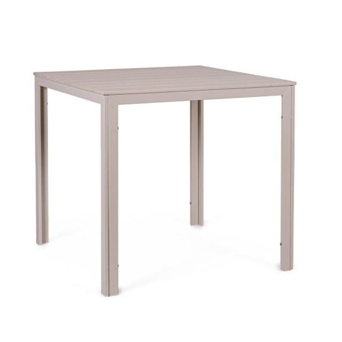 .Il set outdoor Sarita di Bizzotto è la soluzione completa e raffinata per arredare giardini, terrazze e dehors, perfetta sia per ambienti domestici che per l'uso contract. Questo elegante salottino da pranzo è composto da un tavolo quadrato di 78x78 cm e quattro sedie coordinate dotate di comodi braccioli integrati, il tutto declinato in una versatile finitura color tortora. Realizzato con una robusta struttura in acciaio trattato specificamente per l'esterno tramite fosfatazione e verniciatura a polvere, il set garantisce un'eccellente resistenza alla corrosione e agli agenti atmosferici. Il piano del tavolo, le sedute e gli schienali delle sedie sono realizzati in HDPE (polietilene ad alta densità) con un realistico effetto legno venato che unisce il calore estetico del materiale naturale all'estrema praticità, resistenza e facilità di pulizia dei polimeri moderni. Disponibile su Ipershop con spedizione veloce in tutta Italia.