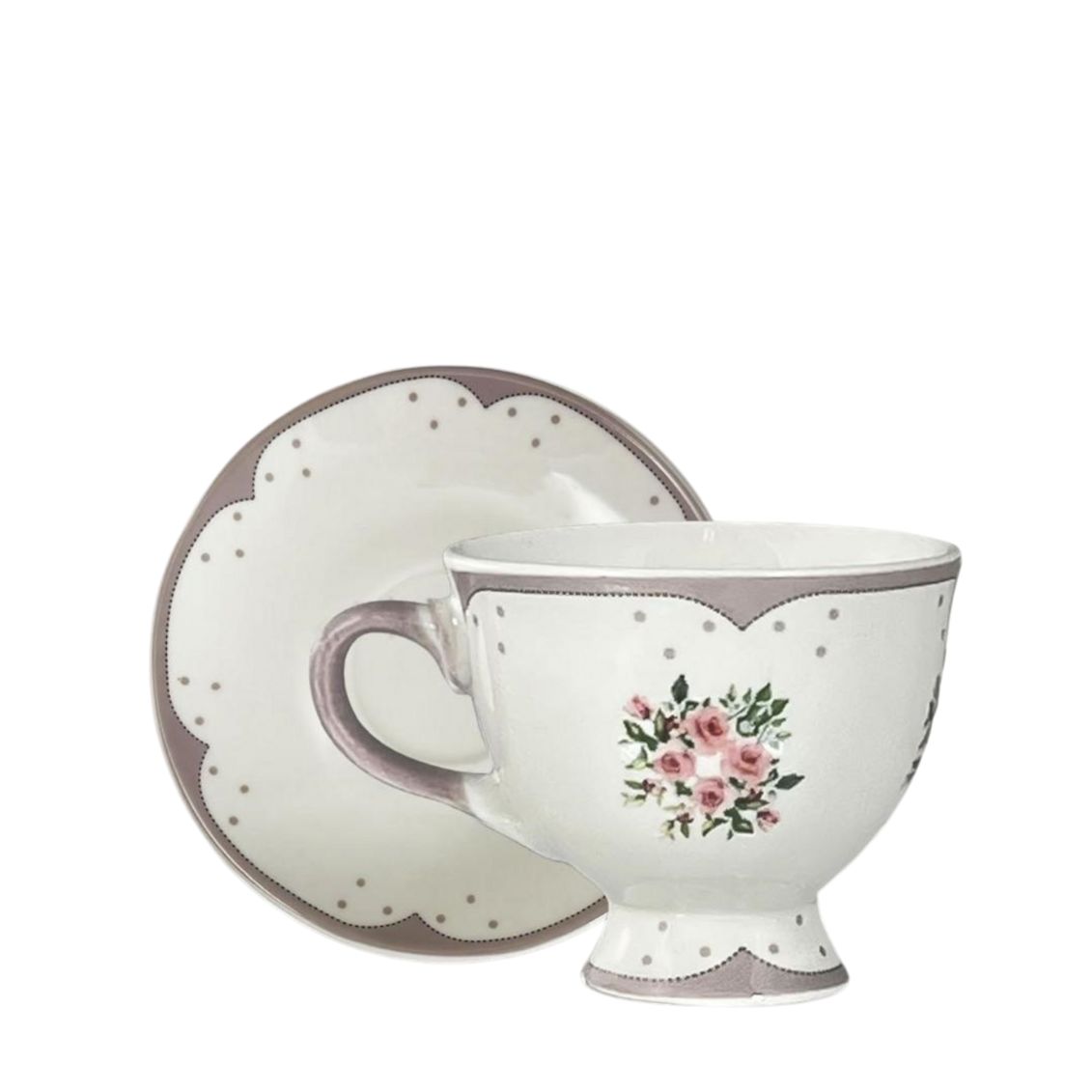 Con un design romantico e raffinato, questa tazza presenta un bouquet di rose rosa** realizzato con delicate petali e foglie verdi, incorniciato da un bordo a pois grigio chiaro e un motivo a festone lungo il bordo superiore. Il piattino abbinato completa l’insieme, creando un set armonioso e accogliente.