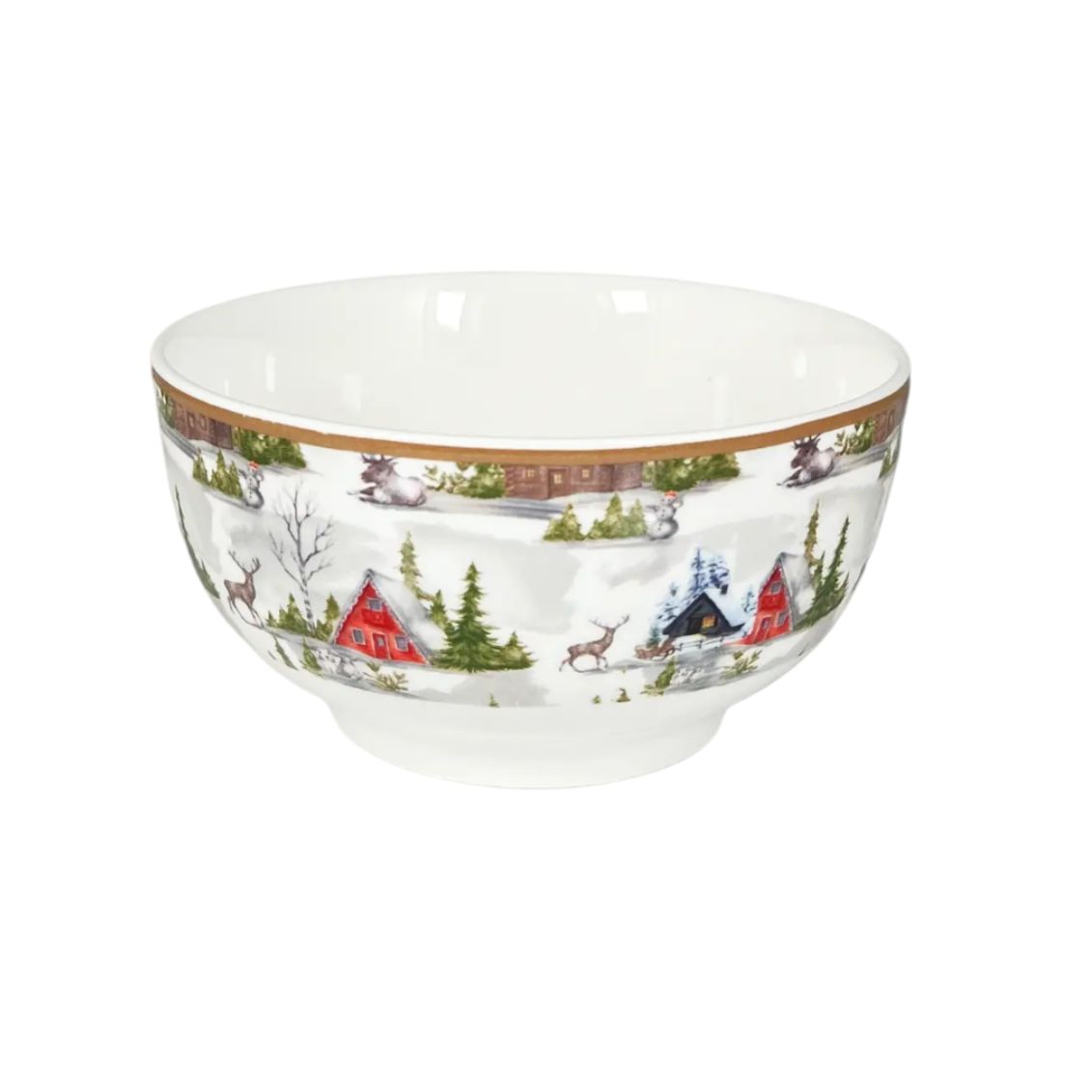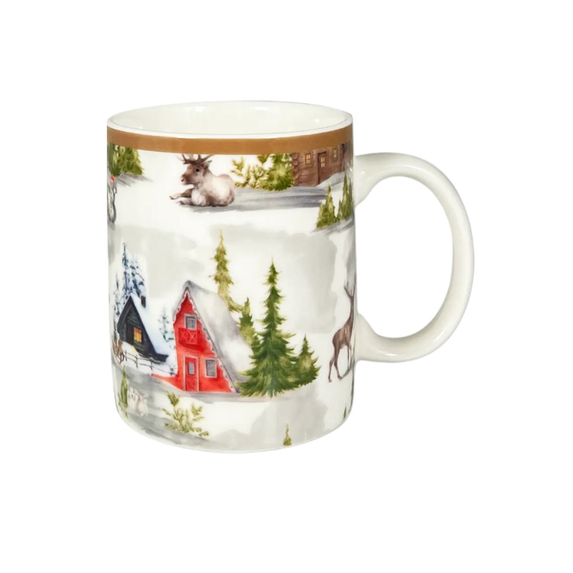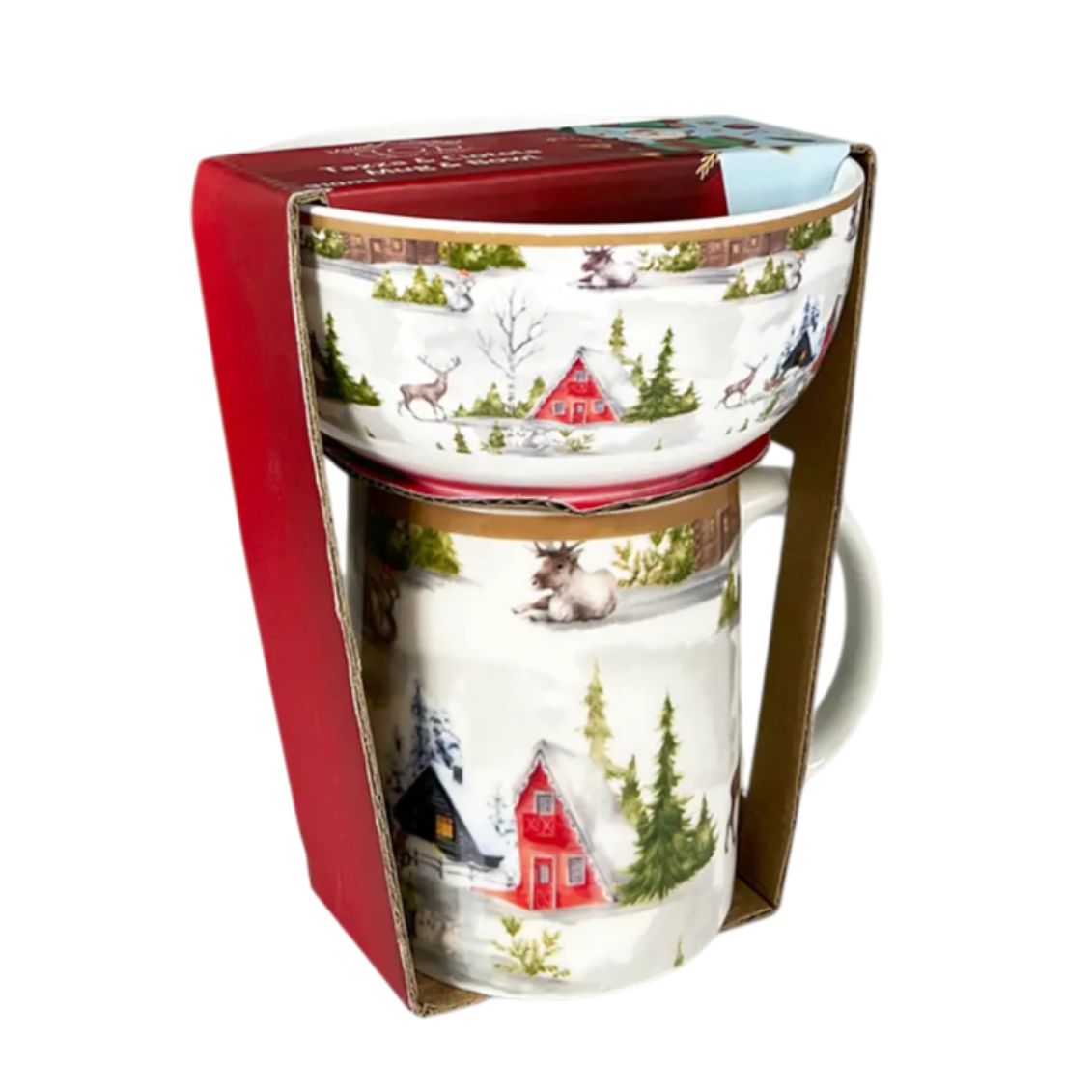 .Set colazione natalizio elegante con tazza 250ml e ciotola 300ml impilabili! Questo raffinato duo Christmas Land presenta decorazioni festive con paesaggio invernale: casette rosse nella neve, abeti, cervi e atmosfera montana. Realizzato in porcellana di alta qualità, resistente e lavabile in lavastoviglie/microonde. Design salvaspazio: la ciotola si impila perfettamente sulla tazza. Tazza Ø8cm h9.5cm ideale per caffè, tè o cioccolata calda. Ciotola Ø12.5cm h6.5cm perfetta per cereali, yogurt o frutta. Bordo dorato elegante. Un set funzionale che unisce praticità quotidiana e atmosfera natalizia raffinata!