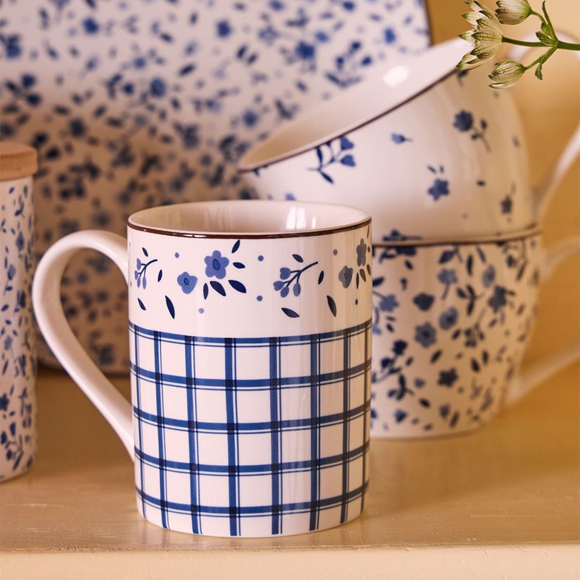 .Mug in elegante New Bone China da 330cc con collezione Cottage, caratterizzata da raffinate fantasie floreali e geometriche in tonalità blu e bianco. Ideale per tè, tisane, latte e caffè americano, resiste al microonde ed è lavabile in lavastoviglie per un utilizzo pratico e quotidiano. La collezione Cottage porta freschezza e armonia in tavola con i suoi colori coordinati.