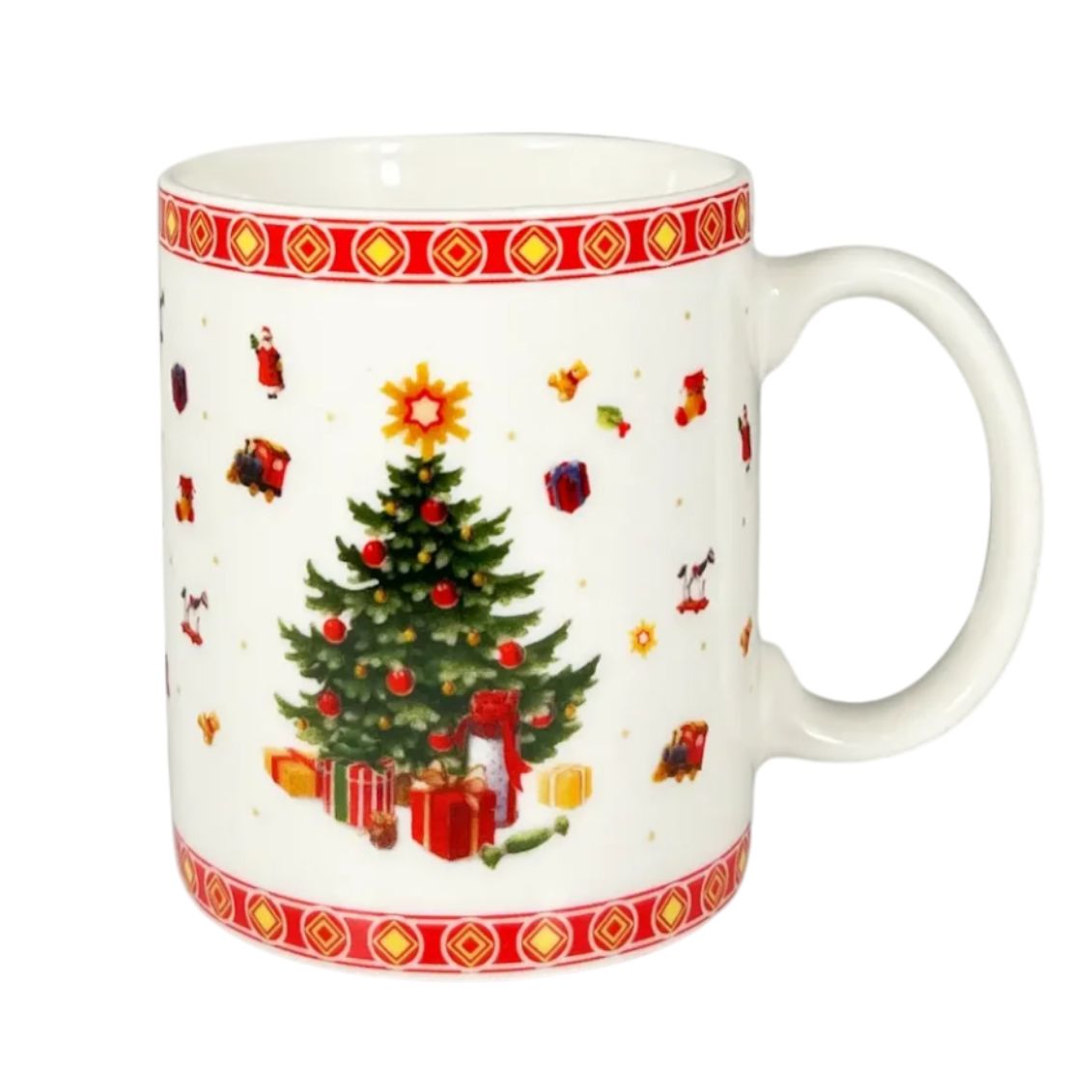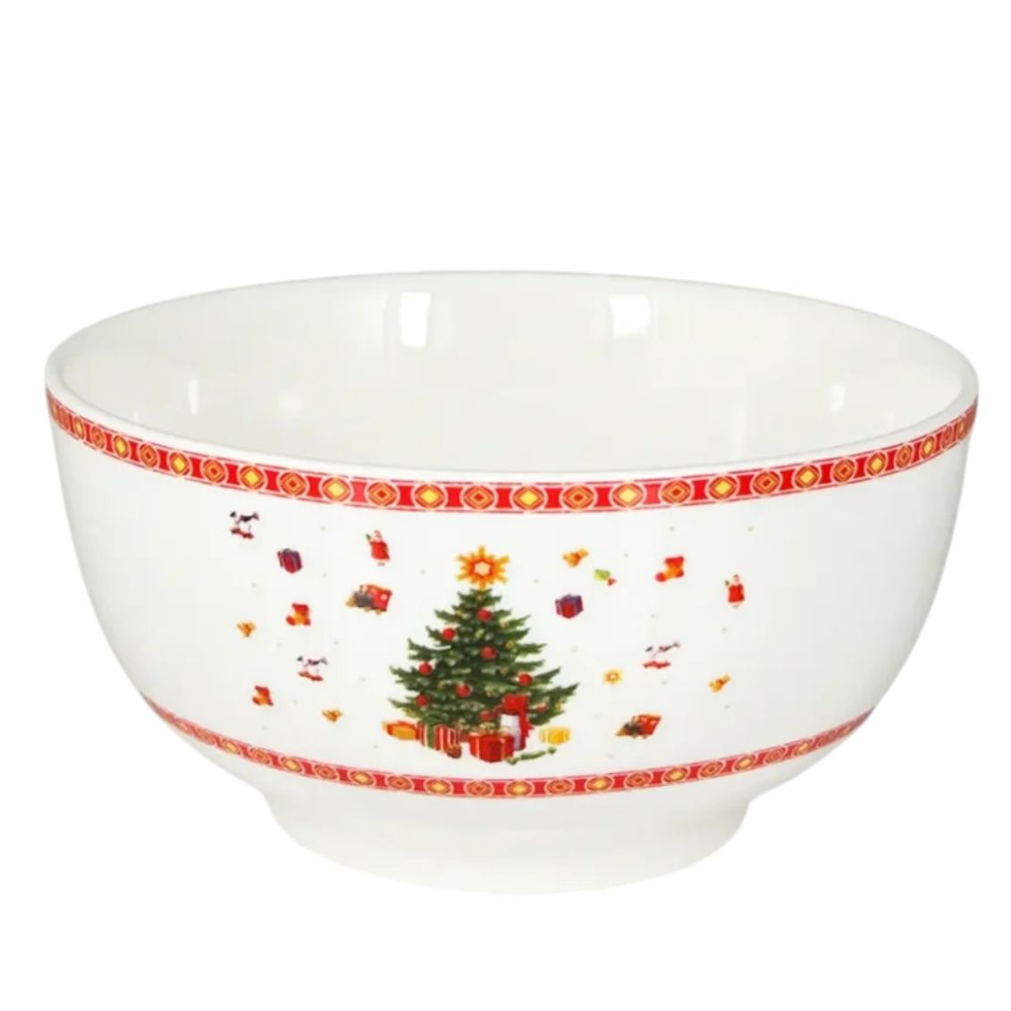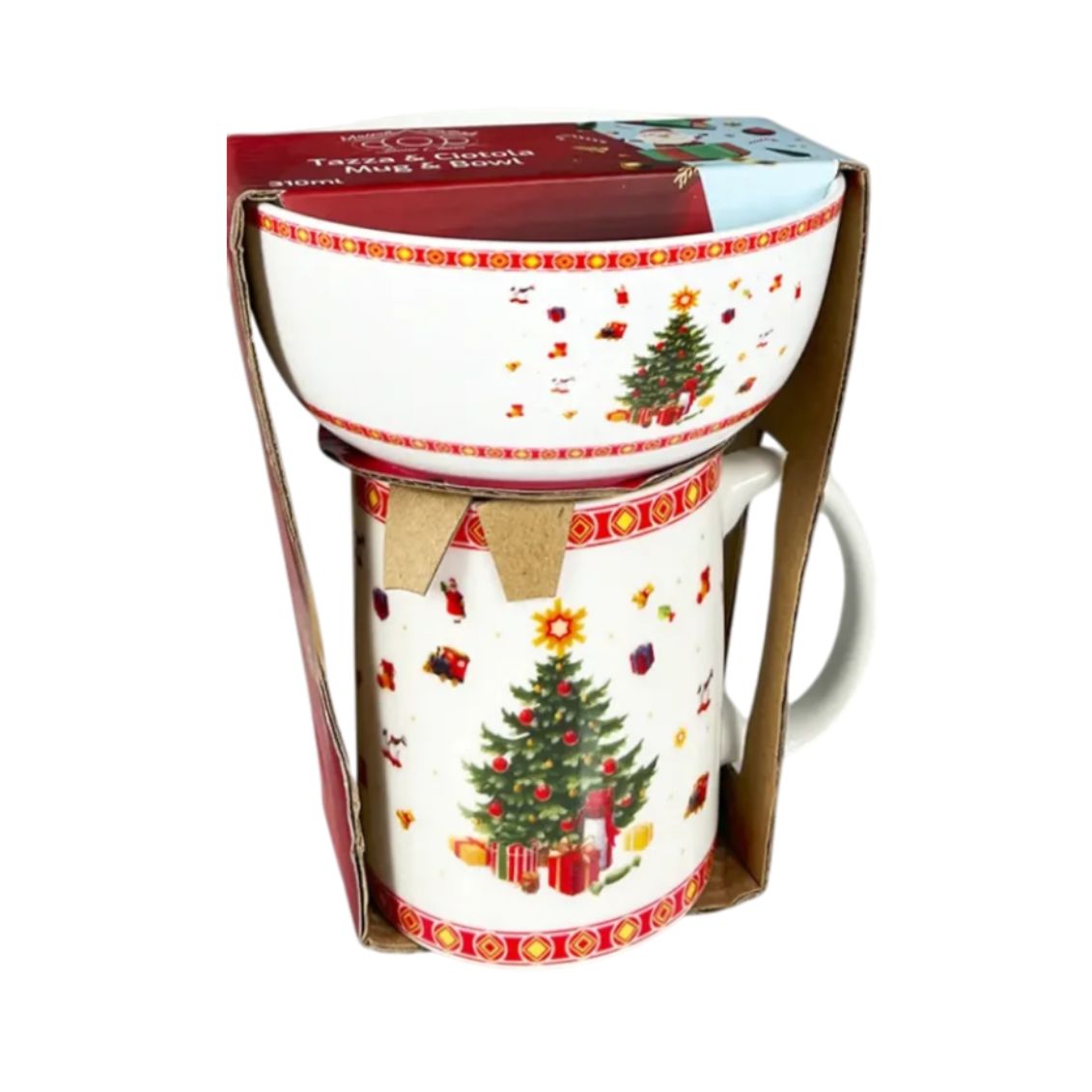 .Set colazione natalizio elegante con tazza 250ml e ciotola 300ml impilabili! Questo raffinato duo Christmas Tree presenta decorazioni festive con albero di Natale addobbato con palline e pacchi regalo, circondato da bordo rosso-oro con piccole decorazioni (caramelle, stelle, regali). Realizzato in porcellana di alta qualità, resistente e lavabile in lavastoviglie/microonde. Design salvaspazio: la ciotola si impila perfettamente sulla tazza. Tazza Ø8cm h9.5cm ideale per caffè, tè o cioccolata calda. Ciotola Ø12.5cm h6.5cm perfetta per cereali, yogurt o frutta. Un set funzionale che unisce praticità quotidiana e atmosfera natalizia raffinata!