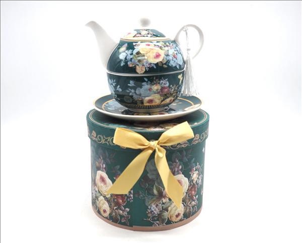 Tea For One Teiera Con Set Tazza E Piattino Con Rose. Verde-Nero