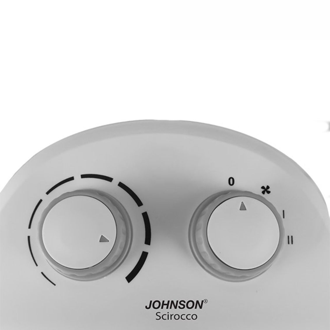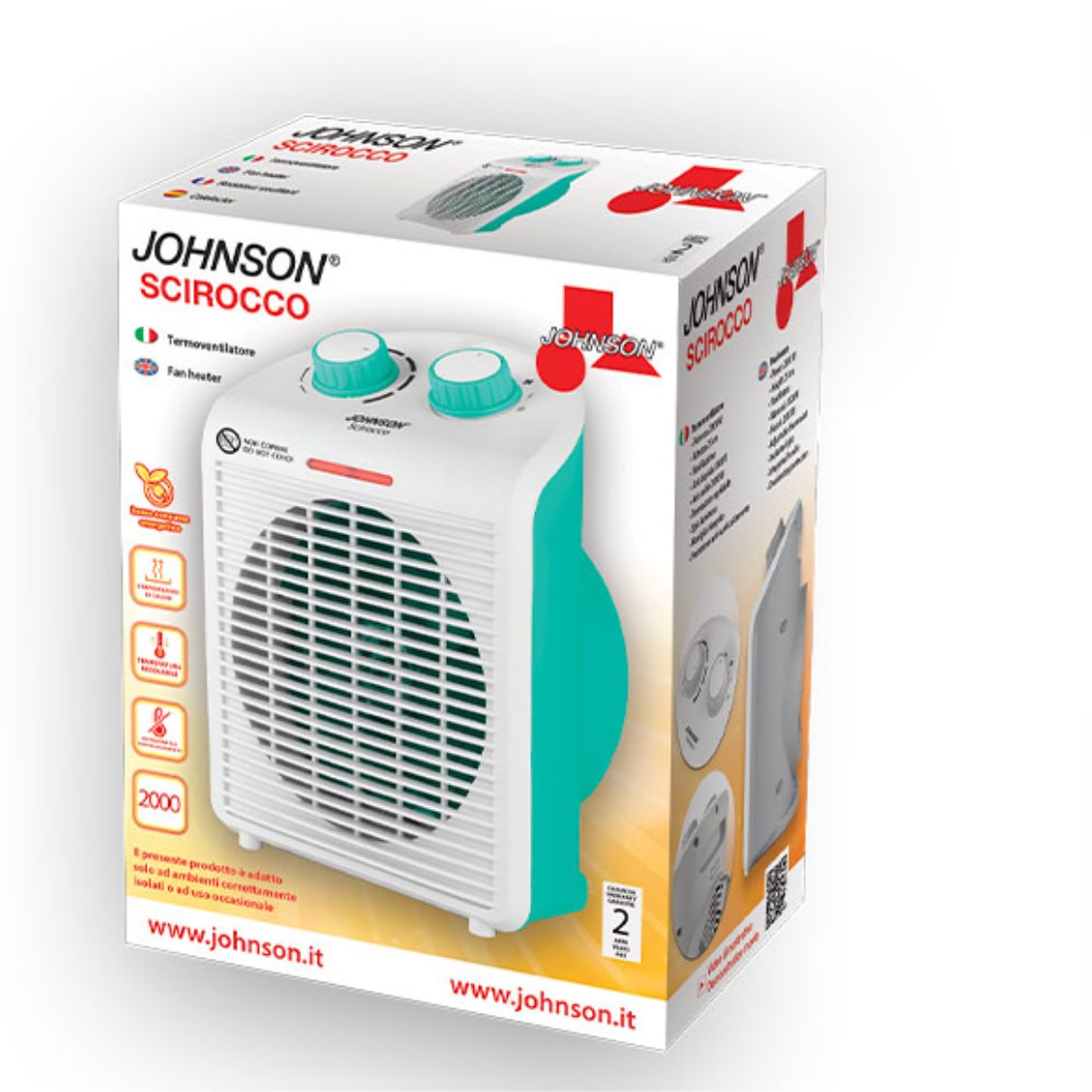 .Praticità e potenza in ogni ambiente! Il termoventilatore Scirocco di Johnson con design compatto e maniglia integrata è facile da trasportare ovunque. Con 2 livelli di calore (1000-2000W) e funzione ventilatore, è la soluzione versatile per tutto l'anno.