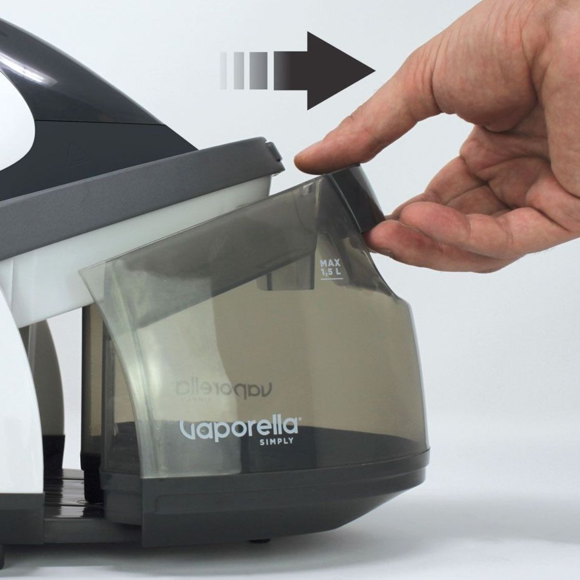 Il design di Vaporella Simply è studiato per la massima praticità. Il ferro leggero non affatica il polso, mentre il comodo alloggiamento per il cavo e il tubo vapore permette di riporre la macchina in modo ordinato e compatto. Il serbatoio trasparente consente di tenere sempre sotto controllo il livello dell'acqua, e le spie intuitive segnalano quando è necessaria la pulizia o il rabbocco.