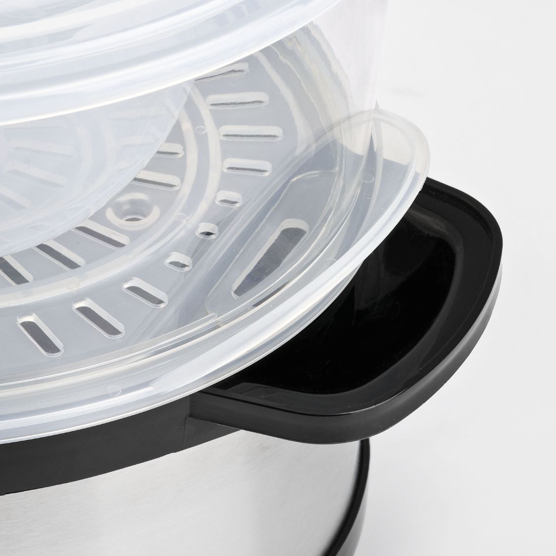 Il coperchio superiore è dotato di sistema anti-gocciolamento che raccoglie la condensa formatasi durante la cottura ed evita che gocce d'acqua cadano sugli alimenti compromettendo consistenza e presentazione. Questo dettaglio tecnico è particolarmente importante per ottenere verdure croccanti e non annacquate, pesci con superficie asciutta e appetitosa e preparazioni che mantengono la loro integrità estetica. Il design del coperchio convoglia la condensa verso i lati, dove viene reindirizzata verso il basso senza toccare il cibo.