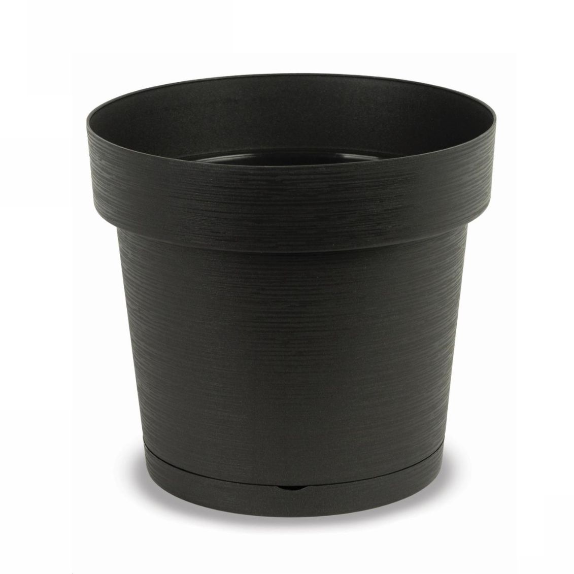 Melrose Glamour è un vaso rotondo troncoconico antracite con finitura a texture incisa, diametro 35 cm, altezza 31 cm, capacità 18 litri, con sottovaso incluso. Codice EAN: 3838851386236.