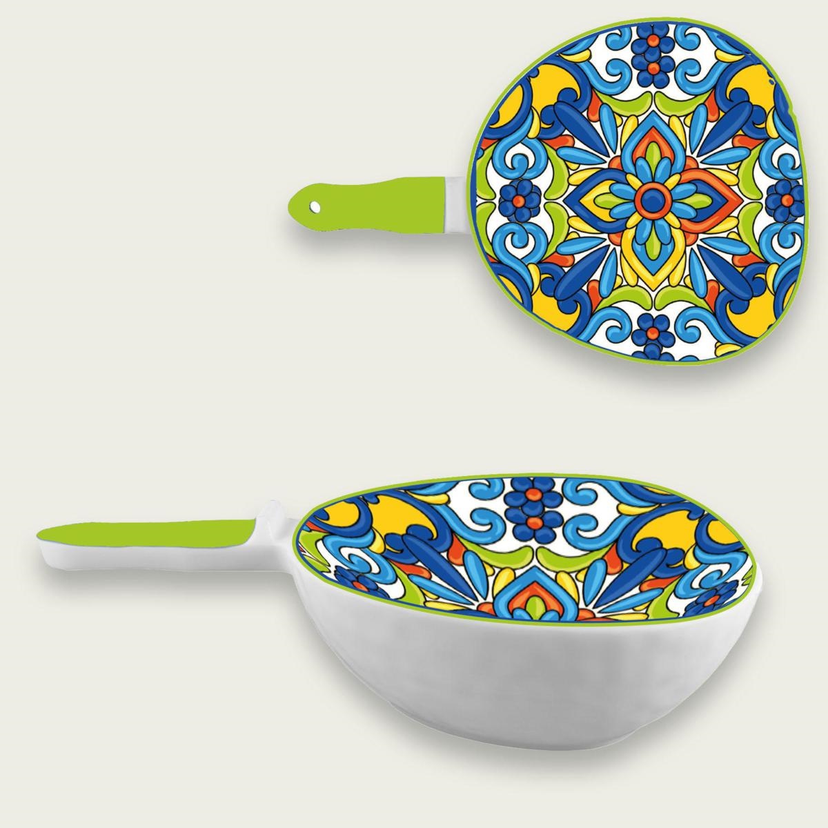 .Il vassoio portata in melamina Lipari da 31x21x8 cm è l'accessorio perfetto per chi desidera aggiungere un tocco di colore e allegria alla propria tavola. Con il suo design originale e i motivi vivaci, questo vassoio è ideale per servire antipasti, stuzzichini e altre prelibatezze con stile.